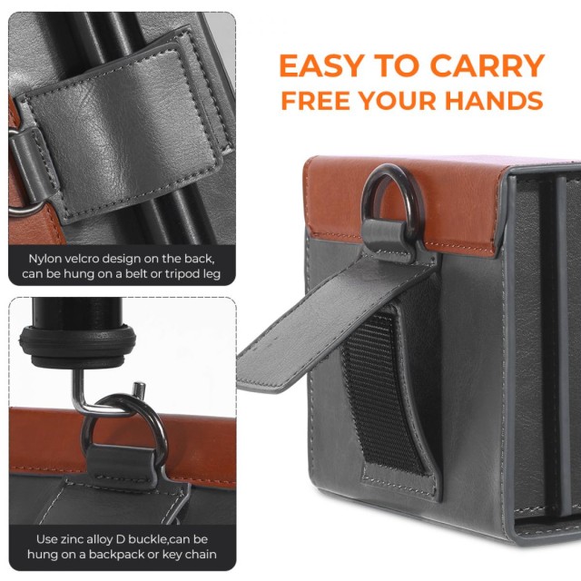 A könnyű hordozhatóság érdekében a tok 2 hordozási lehetőséget kínál: a nejlon tépőzáras pánt segítségével az övén viselheti, vagy a cinkötvözetből készült D csat segítségével a hátizsákjához rögzítheti.