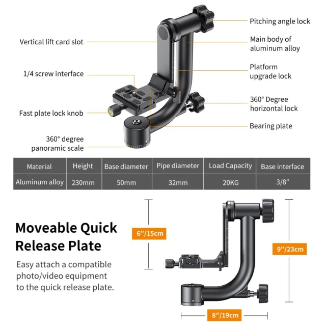 Anyag: alumíniumötvözet Teherbírás: 20 kg. Magasság: 23 cm. Szélesség: 19 cm, szabványos 1/4 hüvelykes kameracsavar