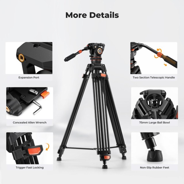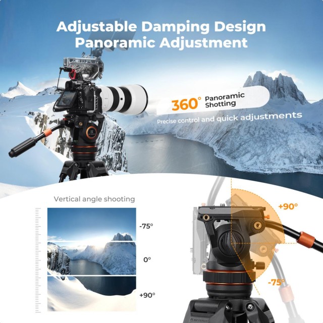 A K&F VA3+BV10 egy professzionális minőségű, folyadékos fejjel ellátott állványrendszer , amelyet a kamera sima, pontos mozgatására terveztek. Hidraulikus csillapítással, 75 mm-es nagy gömbfejjel és a DJI RS2/RS3 és Manfrotto rendszerekkel kompatibilis, sokoldalú gyorskioldó lemezzel biztosítja a stabilitást, a rugalmasságot és a könnyű használatot mind videofelvételek, mind pedig precíz fotókompozíciók készítéséhez.