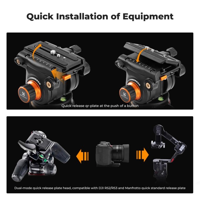 - A professzionális minőségű folyadékfej sima kameramozgást biztosít, alkalmas videózáshoz és finom kompozícióhoz, biztosítva a felvétel stabilitását. A panorámafelvétel fokozatmentesen állítható csillapítással van felszerelve, amely könnyen beállíthatja a csillapítás érzetét és 360 fokos vízszintes forgást érhet el, pontos vezérlést és gyors beállítást biztosítva több felvételi igény kielégítésére.