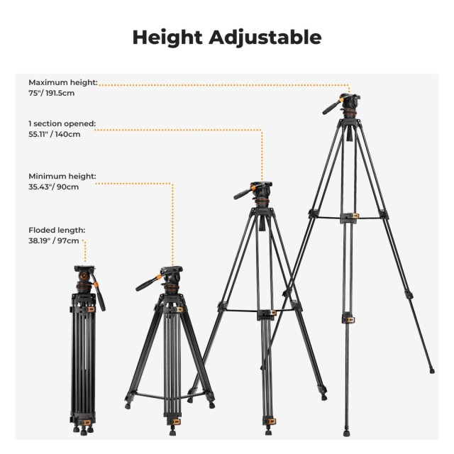 10KG terhelhetőség Fluid Head Tripod kameraállvány Maximális magasság 75.2"/1.91m videó állvány VA3+BV20. A professzionális minőségű fluid fej sima kameramozgatást biztosít, alkalmas videózáshoz és finom kompozícióhoz, biztosítva a felvétel stabilitását. A panorámaképek készítéséhez fokozatmentesen állítható csillapítással van felszerelve, amely könnyen beállíthatja a csillapítás érzetét és 360 fokos vízszintes forgást érhet el, pontos vezérlést és gyors beállítást biztosítva, hogy több felvételi igényt kielégítsen.