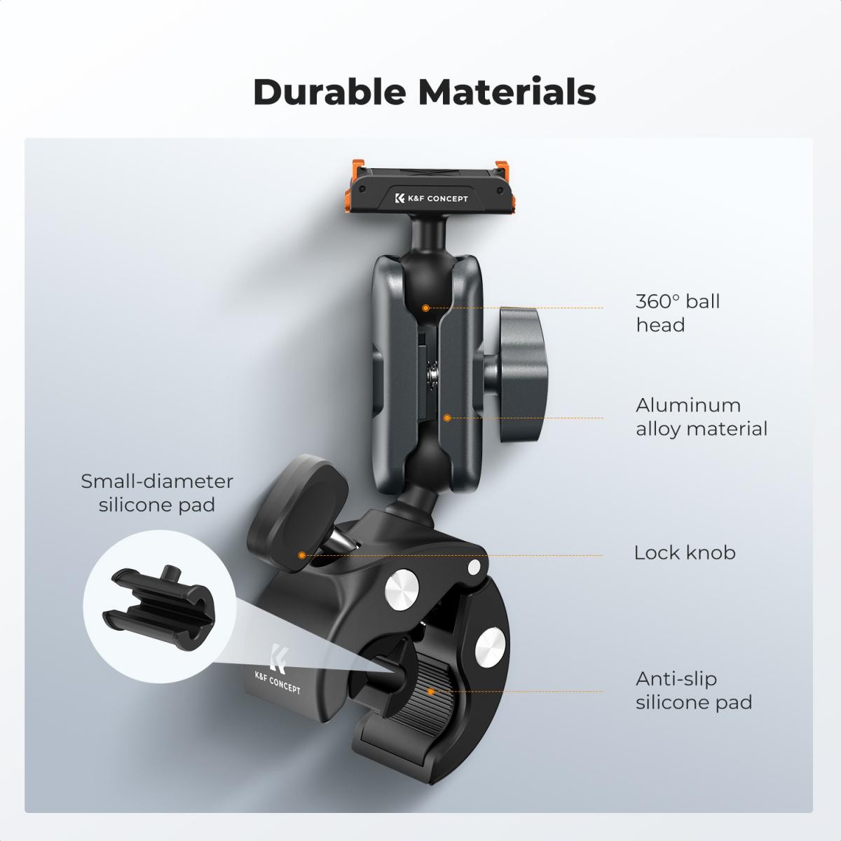 A érintkezési felületcsúszásgátló, így a tartó nem csúszik le könnyen. Az alumíniumötvözetből és nylon üvegszálas kompozitból készült szerkezet szilárd és kopásálló.