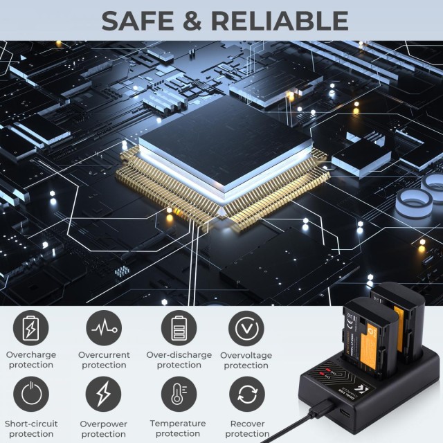 - * 【Biztonsági intelligens védelem】 Az LCD kettős töltő pontosan megjeleníti az akkumulátor töltési állapotát, a töltési folyamat intelligens chipek használatával jobban védi az akkumulátort a túltöltéstől, a magas hőmérséklettől, a túláramvédelemtől, a túlfeszültségvédelemtől, a rövidzárlatvédelemtől