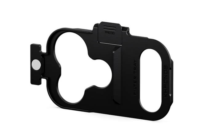 A tálca közvetlenül a Khronos tok erre a célra kialakított nyílásába csúszik, és biztonságosan rögzül a helyén. A beépített biztonsági csat biztosítja, hogy a tálca használat közben véletlenül ne csúszhasson ki, még olyan dinamikus felvételi körülmények között sem, mint a kézi rögzítések, autós tartók vagy gimbal-beállítások.