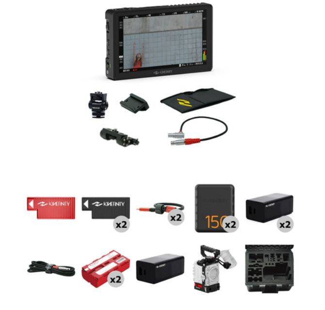 A Kinefinity Camera Core Pack (MAVO Edge Essential Accessory Pack) (A901-001-01) egy komplett, azonnal használható csomag a MAVO Edge 8K/6K kamerához: teljes KineKIT-Edge keret, 5″ 2000-nit KineMON 5U II + forgatható/hideg cipőfoglalat + napellenző, 1 TB KineMAG Nano + 2× üres test, 2× 145 Wh V-mount + 2× 26 Wh L-sorozat + PD töltők, 100 W hálózati kábel, kemény héjú tok – minden, kivéve a kamerát.