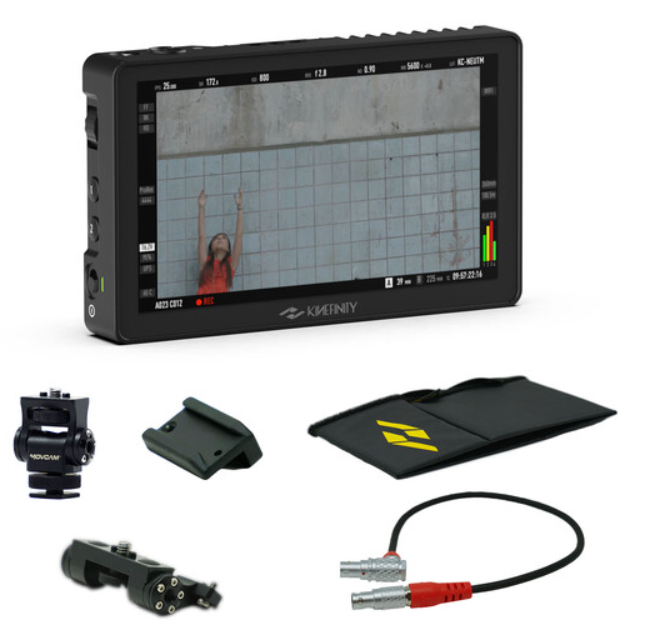 A Kinefinity A912-001-01 KineMON 5U II komplett monitorcsomag egy all-in-one, nappali fényben is jól látható monitorozási megoldás a MAVO Edge 8K, MAVO LF és TERRA 4K kamerákhoz, amely tartalmazza az ultra-fényes, 2000 nit fényerejű, 5 hüvelykes KineMON-5U II érintőképernyőt, 12 hüvelykes derékszögű video-/tápkábelt, forgatható tartót, hidegcipő adaptert, EVF ékblokkot és összecsukható napellenzőt, hogy bármilyen fényviszonyok között azonnal használható legyen a kamerán vagy a felszerelésen.