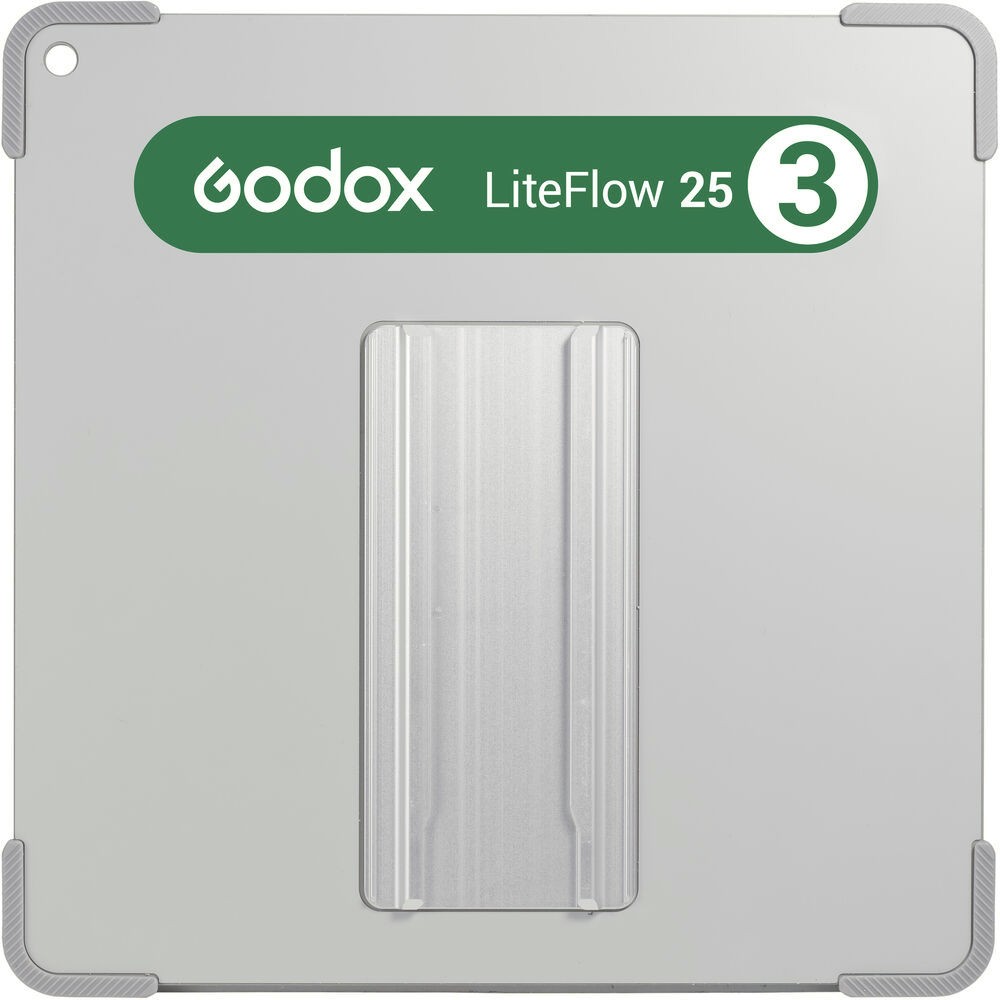 A Godox Knowled LiteFlow 25-D3 egy 25×25 cm-es (10×10") puha fényvisszaverő, amelyet úgy terveztek, hogy diffúz, közvetett kitöltő fényt biztosítson stúdióban és helyszíni felvételeknél egyaránt. A Godox Cine Lighting Reflector rendszerének részeként ez a visszaverő rendkívül fényvisszaverő alumíniumbevonatú felülettel rendelkezik, amelynek intenzitásvesztése mindössze 3%, színvisszaadása pedig 100%, így pontos és egyenletes megvilágítást biztosít. Puha, tükörszerű felülete lágy, diffúz árnyékokat hoz létre, így ideális a kiemelések kitöltésére éles élek nélkül. A LiteFlow 25 zöld színkóddal és 3-as számmal jelzi a puha fénydiffúziós típusát, ami egyszerűsíti a munkamenetet a forgatáson. A 403 g-os (14,2 oz) könnyű súlyú, saját fejlesztésű sínre szerelhető rendszerrel ellátott reflektor könnyen beállítható, és rugalmas karokkal más reflektorokkal is kombinálható. Hatékony kialakításának köszönhetően egyetlen fényforrás többször is átirányítható, így nincs szükség további szerelvényekre, és szűk helyeken is kreatív megvilágítás érhető el.