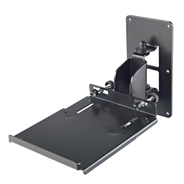 Sokoldalú fali tartó lemezzel monitorokhoz és hangszórókhoz 15 kg-ig. A tálca mindkét oldalra +3° és -20° között variálhatóan elforgatható. A rés szélességében mozgatható 2 rögzítőcsavar segítségével a doboz egyszerűen és biztonságosan rögzíthető a tartóhoz.