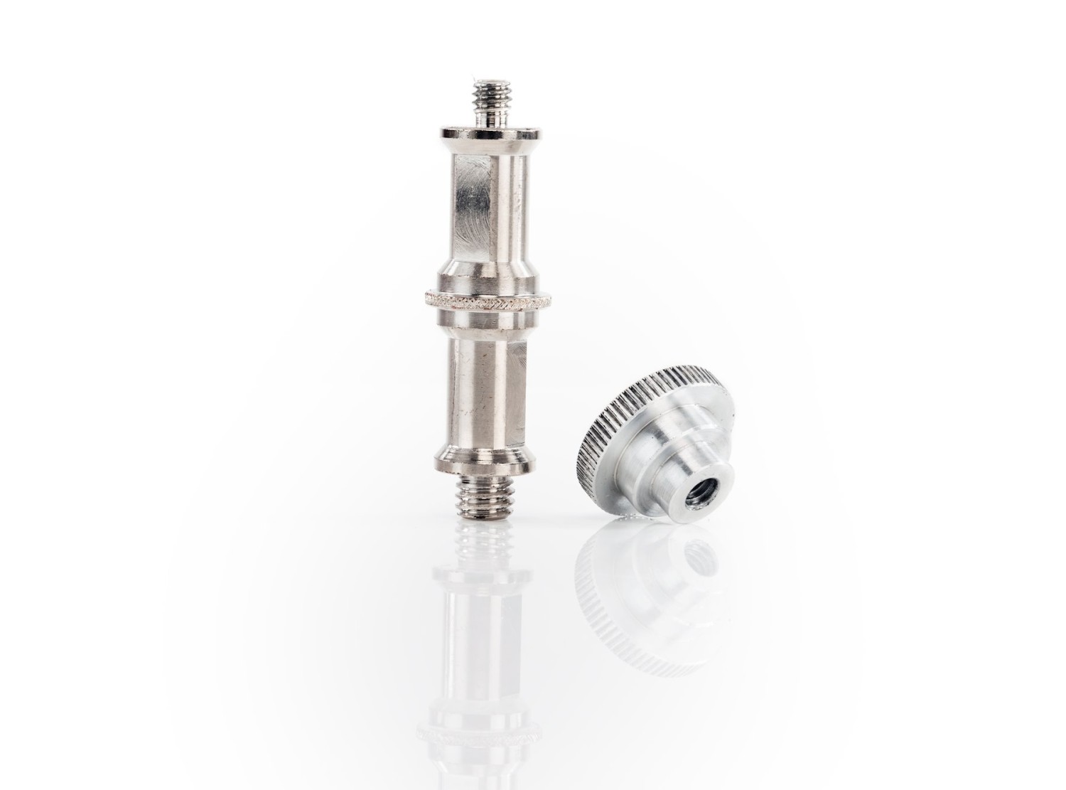 A tartós fémötvözetből készült csatlakozó standard 5/8" (16 mm) rögzítési átmérővel rendelkezik, valamint 1/4"-20 és 3/8"-16 menetes csatlakozásokkal, így biztosítva a kompatibilitást a világítóberendezések és állványok széles skálájával. A csavarhoz egy recézett rögzítőgomb tartozik, amely szilárd és biztonságos rögzítést biztosít, megakadályozva a nem kívánt elmozdulást használat közben. Kompakt és megbízható, ez az adapter ideális stúdió- és helyszíni fotósok számára, akiknek megbízható csatlakozásra van szükségük a vakufejek és a softbox-módosítók között.