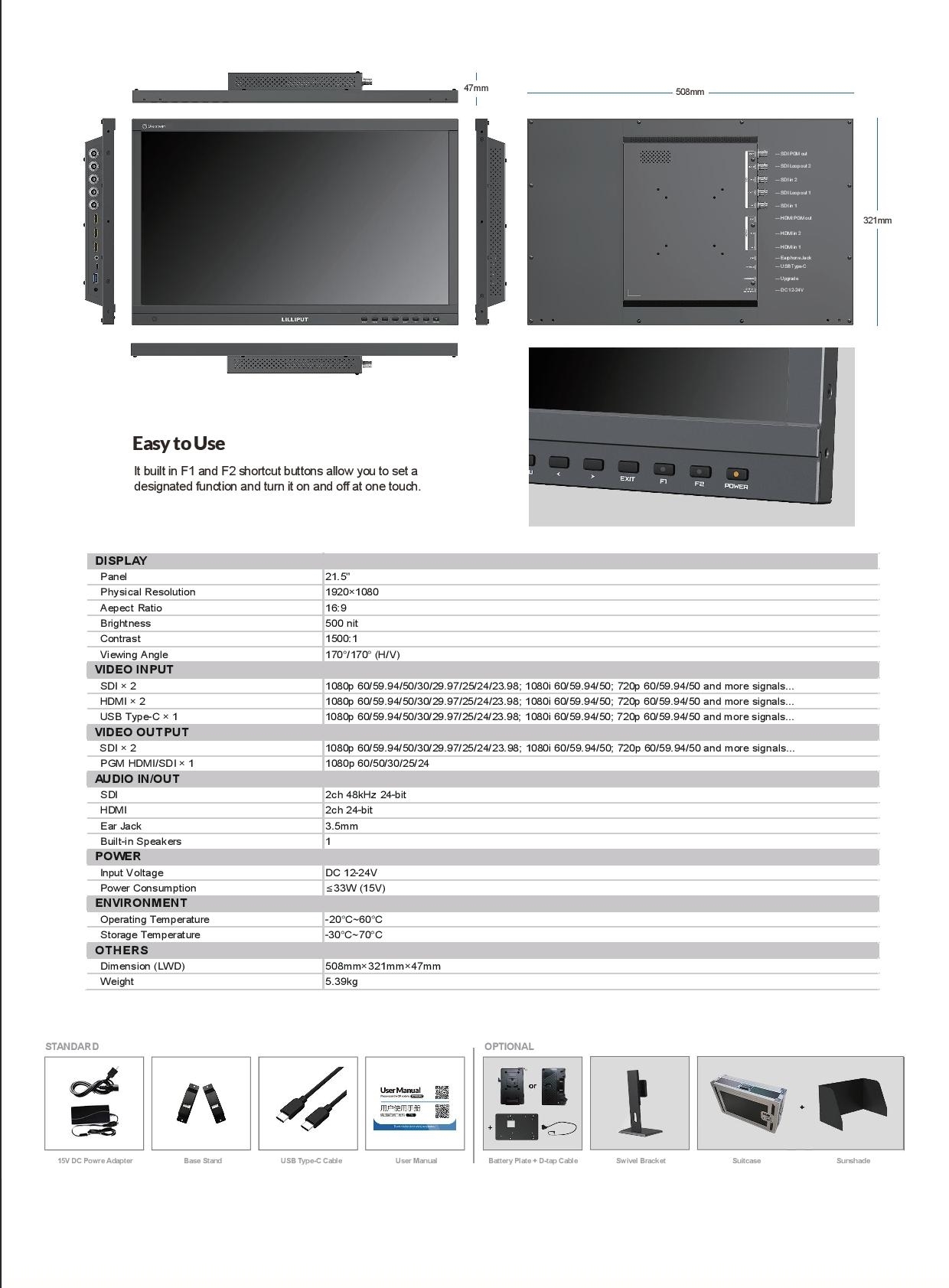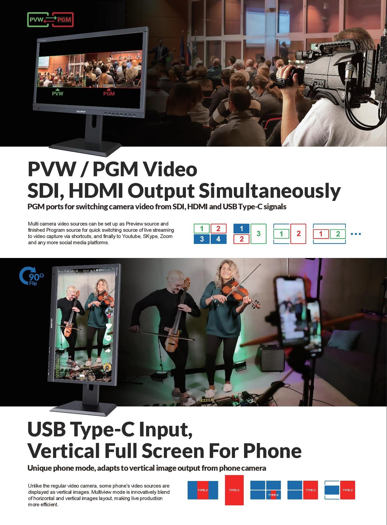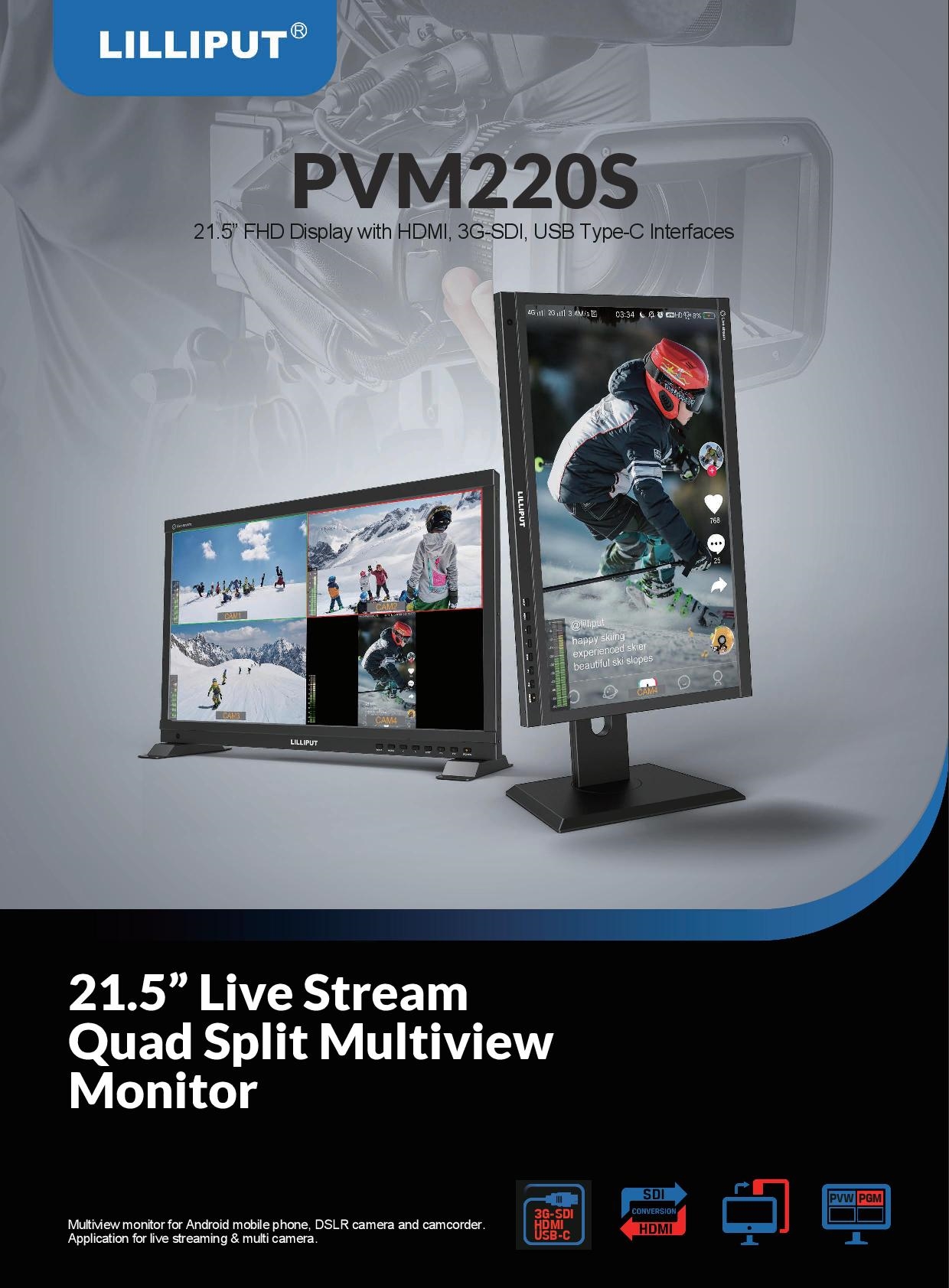 A PVM220S 21,5" 3G-SDI/HDMI Broadcast Monitor a Lilliput-tól négy osztott kijelzővel, előnézeti és programkimenettel, valamint a közösségi médiatartalmakhoz alkalmas vízszintes és függőleges megjelenítési móddal rendelkezik. Ez az 1920 x 1080 felbontású monitor 3G-SDI, HDMI és USB Type-C hangbemenetet, valamint 3G-SDI és HDMI kimenetet biztosít. A monitor 500 cd/m2 fényerőt, 1500:1 kontrasztot, 2 csatornás képernyőn megjelenő hangfigyelést és több képalkotó eszközt kínál a pontos megjelenítés létrehozásához.