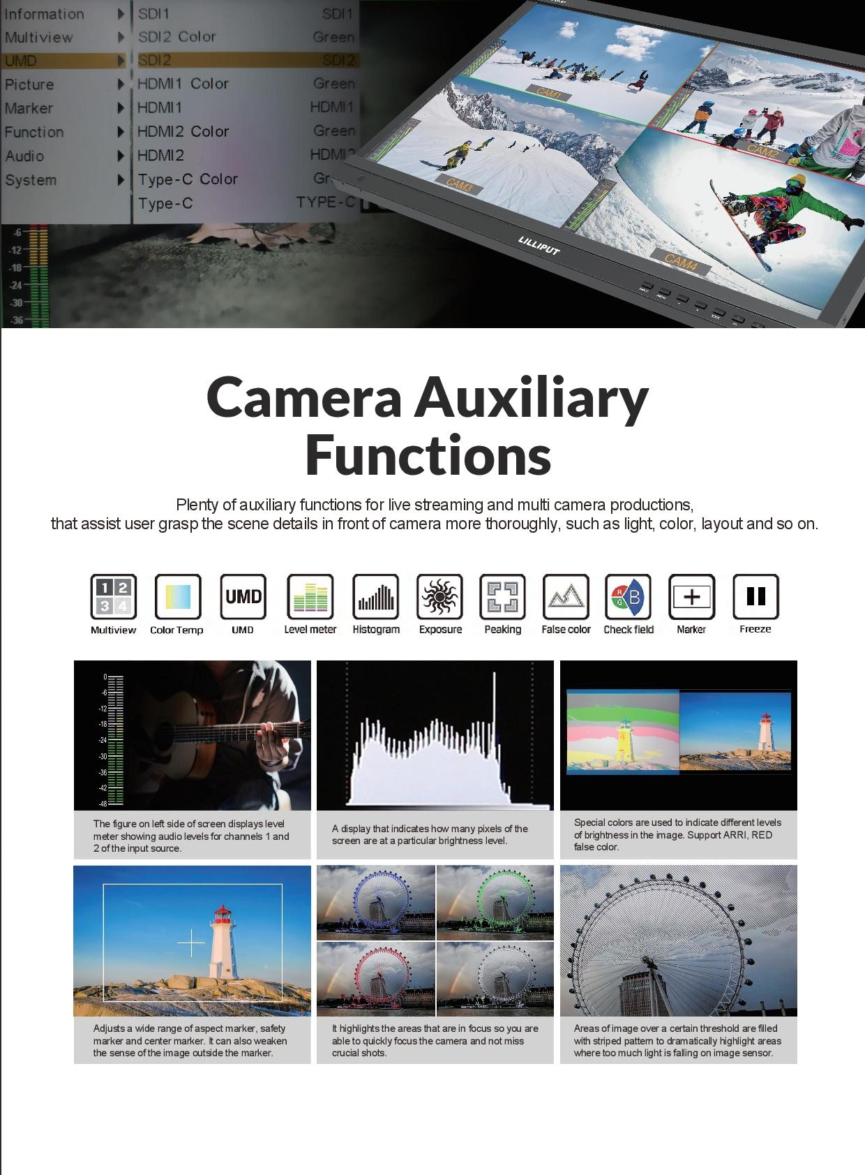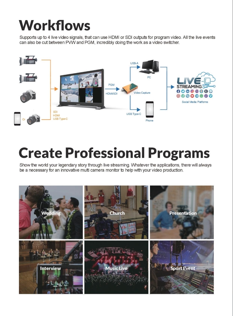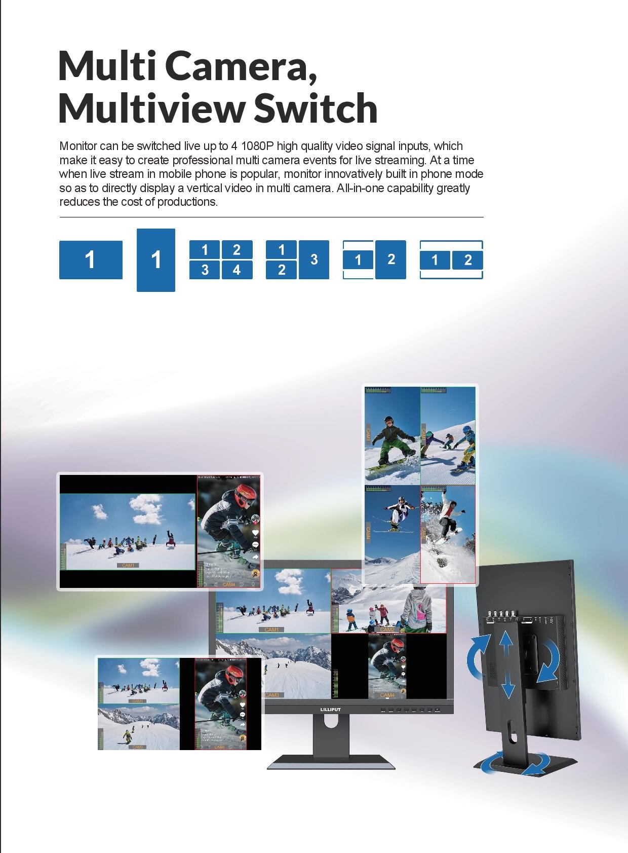 A PVM220S 21,5" 3G-SDI/HDMI Broadcast Monitor a Lilliput-tól négy osztott kijelzővel, előnézeti és programkimenettel, valamint a közösségi médiatartalmakhoz alkalmas vízszintes és függőleges megjelenítési móddal rendelkezik. Ez az 1920 x 1080 felbontású monitor 3G-SDI, HDMI és USB Type-C hangbemenetet, valamint 3G-SDI és HDMI kimenetet biztosít. A monitor 500 cd/m2 fényerőt, 1500:1 kontrasztot, 2 csatornás képernyőn megjelenő hangfigyelést és több képalkotó eszközt kínál a pontos megjelenítés létrehozásához.