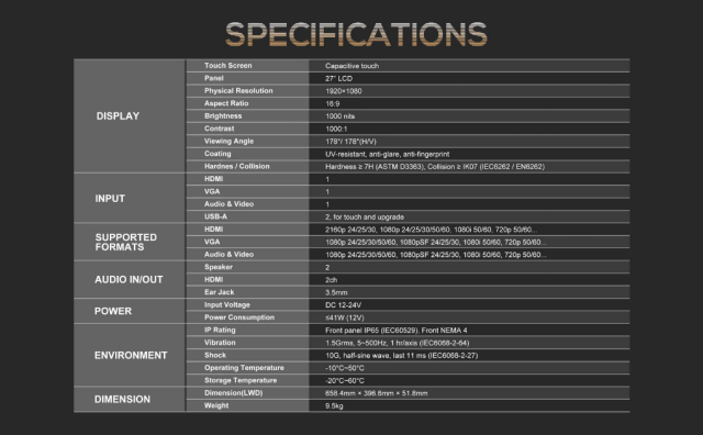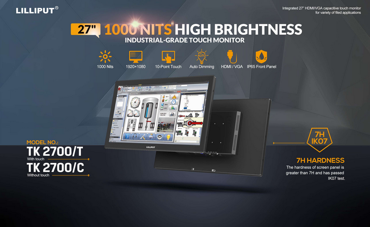 A Lilliput TK2700-NP/C egy 27 hüvelykes, fém kerettel ellátott monitor, 1000 nit fényerejű, 10 pontos kapacitív érintőképernyővel, HDMI, VGA és RCA/Composite bemenetekkel, tükröződésmentes/ujjnyommentes/UV-ellenálló bevonattal, kesztyűvel is használható érintőképernyővel, IP65/NEMA 4 elülső panel víz- és porállósággal, 7H felületi keménységgel és IK07 ütésvédelemmel rendelkezik, így ideális a közterületeken történő, strapabíró telepítéshez.