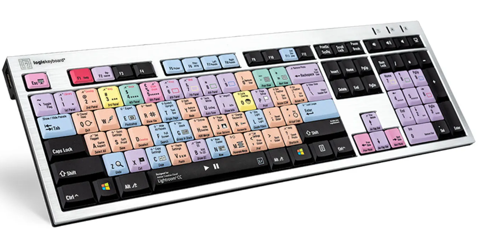 A Logickeyboard Adobe Lightroom CC PC Slimline billentyűzet (brit angol) egy speciális, színkóddal ellátott billentyűzet, amelyet az Adobe Lightroom CC szerkesztési munkafolyamatainak egyszerűsítésére és gyorsítására terveztek. Jól jelölt gyorsbillentyűkkel, vékony, ergonómikus kialakítással és plug-and-play USB-csatlakozással rendelkezik.