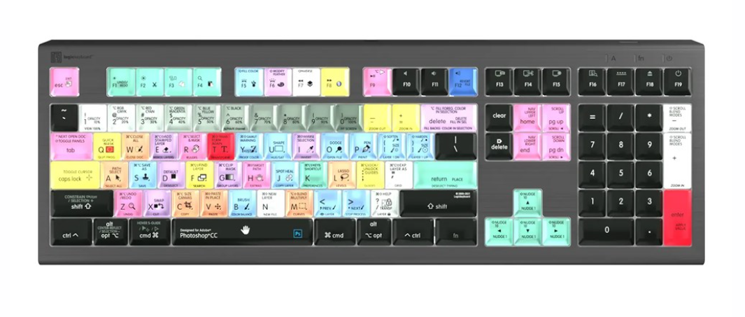 A Logickeyboard Photoshop CC Mac billentyűzetborító egy vékony, színkóddal ellátott
