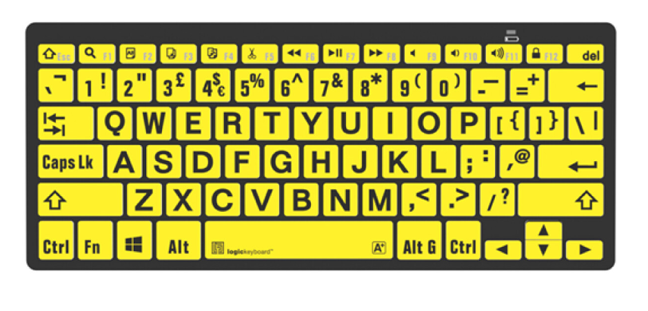 A Logickeyboard XLPrint Bluetooth Black on Yellow UK PC billentyűzet az iparág első, nagy betűméretű Bluetooth mini billentyűzete, amelyet látássérült és idősebb felhasználók számára terveztek. A sárga háttérre nyomtatott, nagy kontrasztú fekete betűk javítják a láthatóságot, csökkentik a gépelési hibákat és a szem fáradását.
