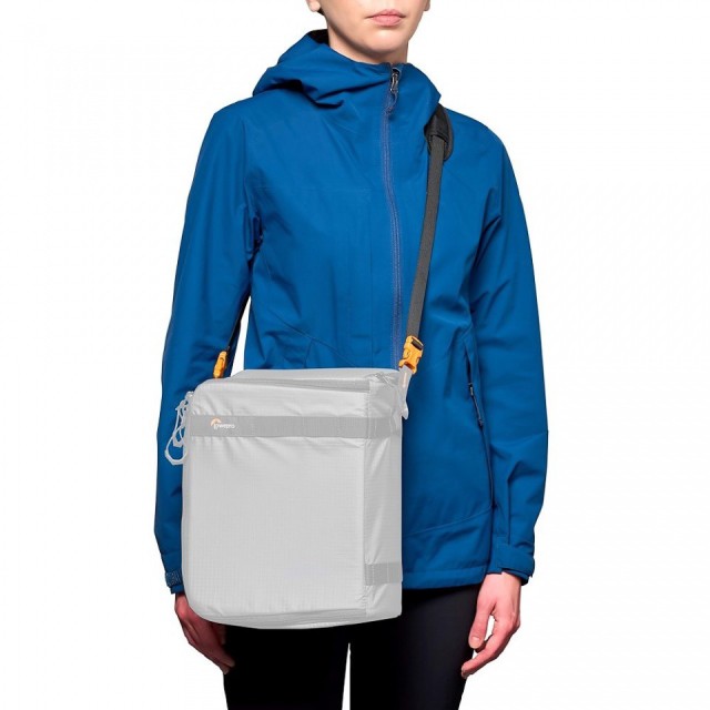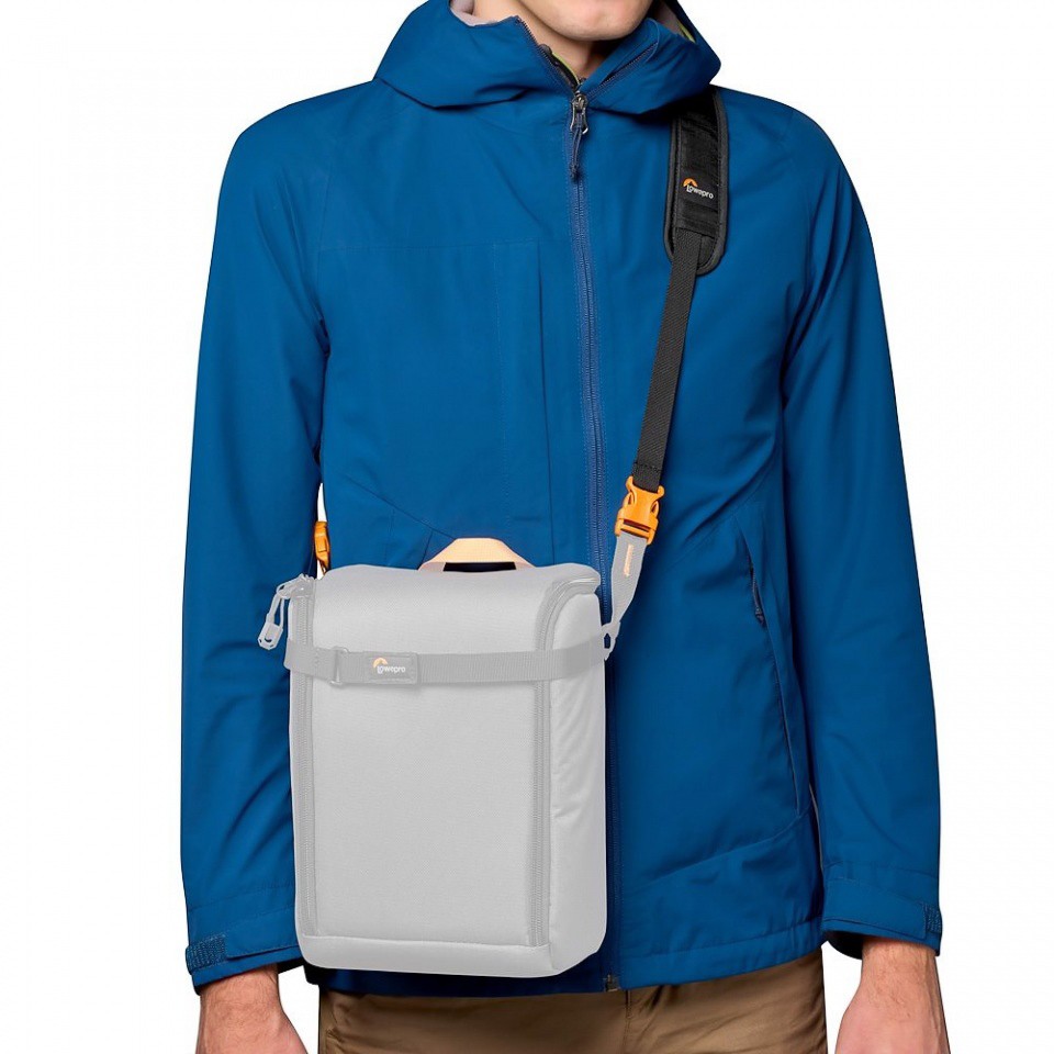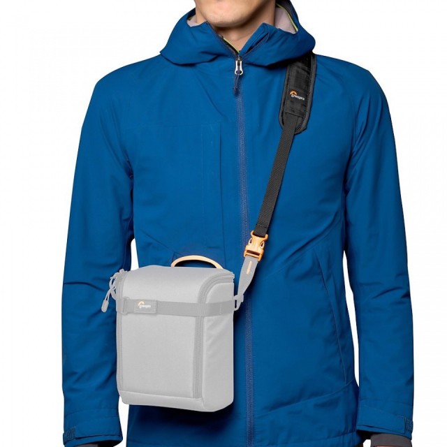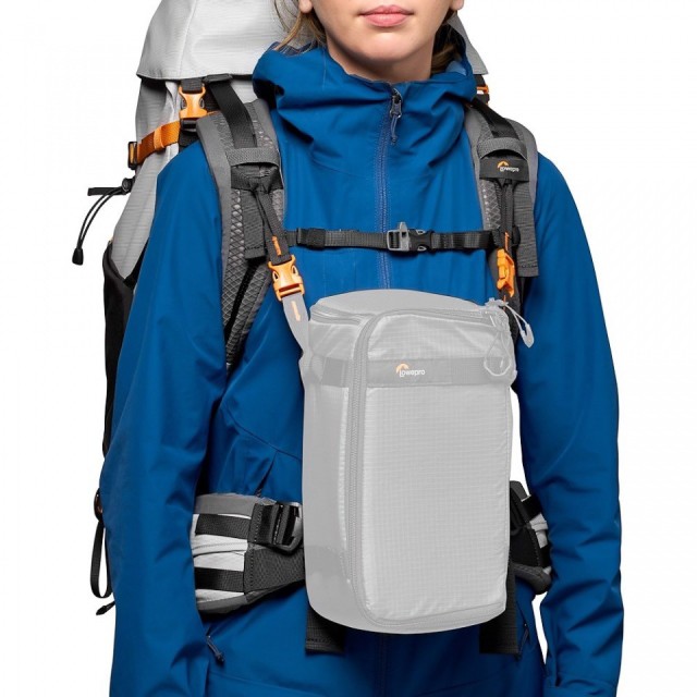 A két rögzítő csatlakozó segítségével a fényképezőgép vagy a GearUp doboz közvetlenül a Lowepro hátizsák vállpántjához rögzíthető.