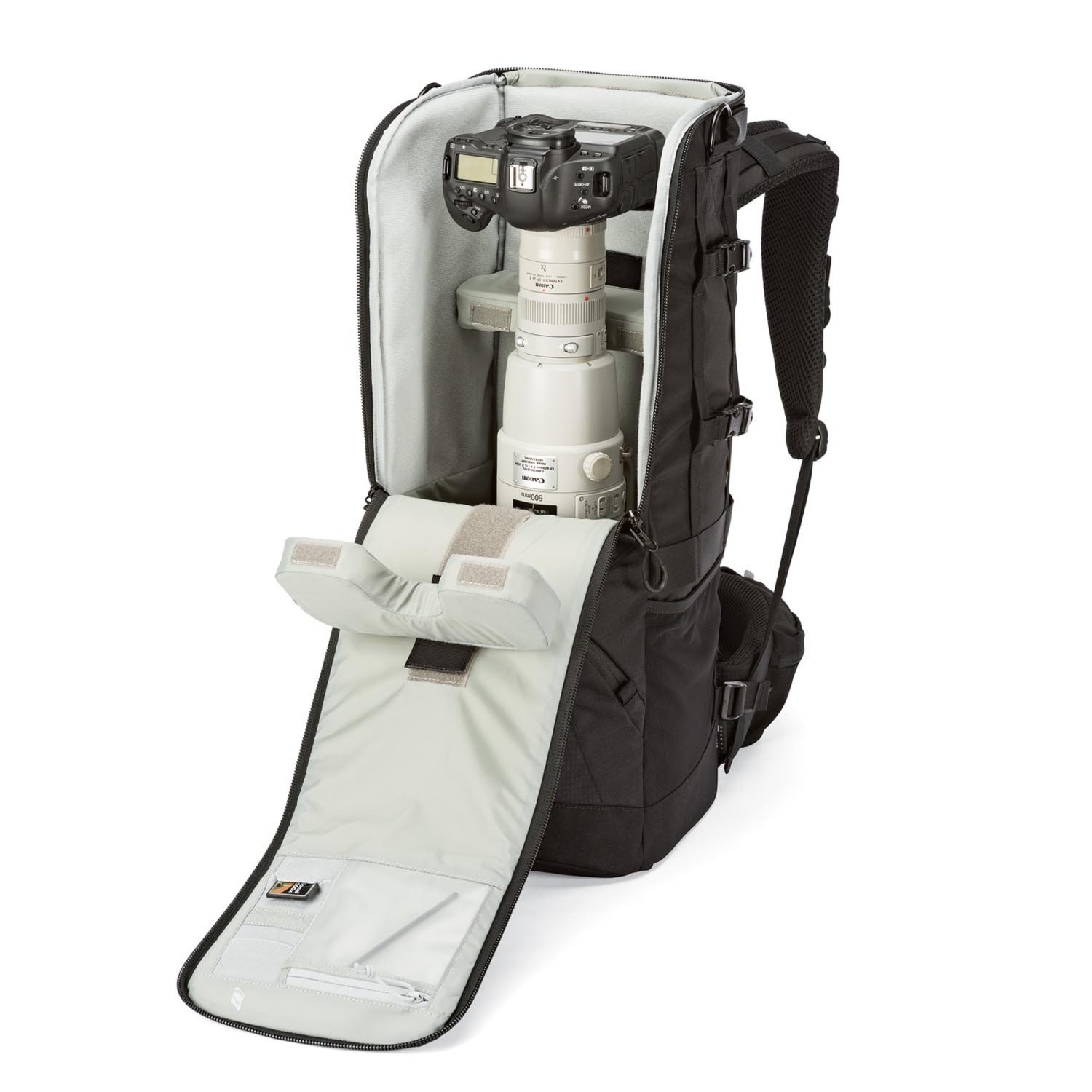 Hordozza és védje professzionális fényképezőgépét a csatlakoztatott 600 mm f/4 objektívvel vagy a különálló 800 mm objektívvel a fekete Lowepro Lens Trekker 600 AW III táskával. A táska elegendő helyet biztosít a felszerelt napellenzőnek, és egy állványt is befogad.