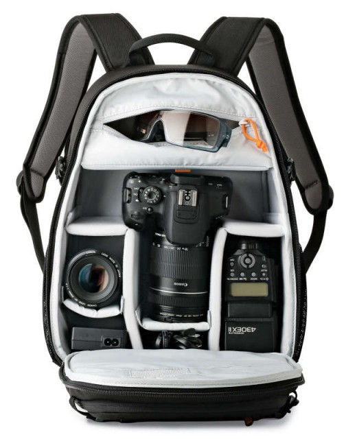 A tágas , dupla cipzáras főrekesz két nagy és két kicsi, párnázott, állítható elválasztóval rendelkezik, amelyek megvédik a fényképezőgépét, 2 objektívét, a vakut és egyéb kiegészítőket, míg a belső cipzáras zseb elválasztja a kábeleket és a tartalék akkumulátorokat.