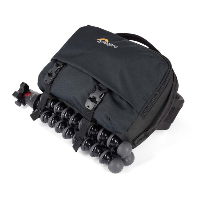 Van egy kis elülső cipzáras zseb a kulcsok, telefon vagy más apró tárgyak számára; a fő cipzáron pedig a fényképezőgép rekeszéhez férhet hozzá. A két pánt segítségével az alsó elülső panelhez rögzíthet egy asztali állványt vagy kabátot. A táska belsejében egy kiegészítő vizespalack-tartót talál, amelyet a pántok segítségével használhat.