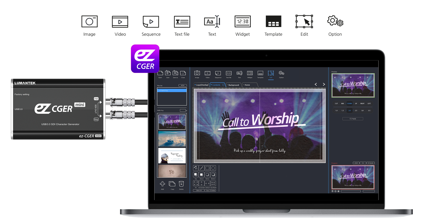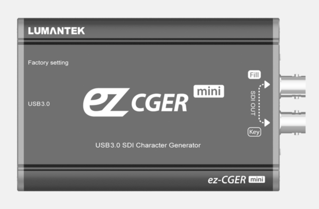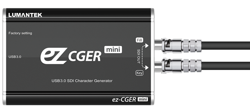 A mini átalakító méretével és egyszerű USB 3.0 csatlakozásával az ez-CGER mini SDI formátumban generálja a Fill & Key-t. Csatlakoztassa ezeket a saját videóváltójához, hogy élőben közvetítse videóját CG-vel! Illesszen be képeket, videókat, szöveges fájlokat és még sok mást a LUMANTEK ez-CGER dedikált szoftverével.