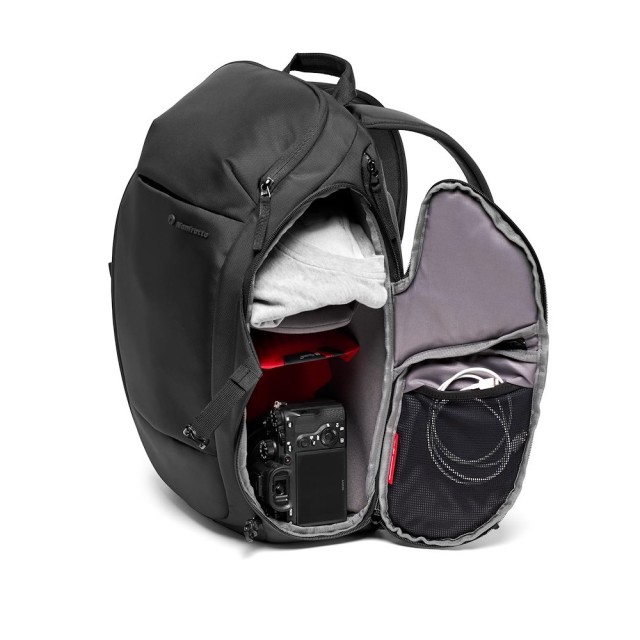 A Manfrotto Advanced Travel Backpack III egy kompakt és könnyen hordozható hátizsák, amely elengedhetetlen utazásaihoz. Ez az eredeti hátizsák DSLR-ekhez vagy tükör nélküli fényképezőgépekhez készült, és fényképezőgép-felszerelésének és média-kiegészítőinek tárolására és szállítására tervezték. A hátizsák egyik oldaláról hozzáférhető felső és alsó részével, valamint bővíthető oldalsó zsebével ezt a hátizsákot igényeihez igazíthatja. Belefér egy DSLR fényképezőgép, például a Canon EOS 5D Mark IV, valamint további 3-4 objektív, méretüktől függően (például 16-35/2,8, 24-70/2,8 vagy 70-200/2,8). Alternatívaként elfér benne egy tükör nélküli fényképezőgép, például egy Sony Alpha 70-200 mm f/4 objektívvel, valamint egy DJI Mavic Pro 2 több akkumulátorral és távirányítóval. A párnázott fényképezőgép-rekesz az új Manfrotto M-Guard™ védelmi rendszerrel rendelkezik. Ez a rendszer speciális, nagy sűrűségű EVA habból készül, amely rendkívüli ütéselnyelő képességet biztosít nagyon vékony profil mellett. A testreszabható hajtogatási minták maximális sokoldalúságot biztosítanak a fényképezőgép-felszerelés teljes védelme mellett, miközben maximalizálják a helyet. Ha több helyre van szüksége, a bővíthető, párnázott oldalsó zseb további helyet biztosít egy utazási állványnak vagy kézi stabilizátornak, például a DJI Osmo Mobile 2-nek. A hátizsák elülső részén egy intelligens külső csatlakozó is található az állványhoz. A kényelmes oldalsó hozzáférési pontok révén felszerelése mindig kéznél van, így soha nem marad le a fontos felvételekről, a felső rekesz pedig ideális kiegészítők és személyes tárgyak tárolására. Ez a kialakítás azt jelenti, hogy soha többé nem kell keresnie a szükséges tárgyakat. További jellemzők közé tartozik egy speciális, párnázott 15 hüvelykes laptopzseb, amely extra védelmet nyújt és útközben is könnyen hozzáférhető. Ez a hátizsák a válaszfalak eltávolításával könnyen átalakítható napizsákká. Az összes külső anyag vízlepergető kezelést kapott, és rossz időjárás esetén a mellékelt esővédővel tovább erősíthető.