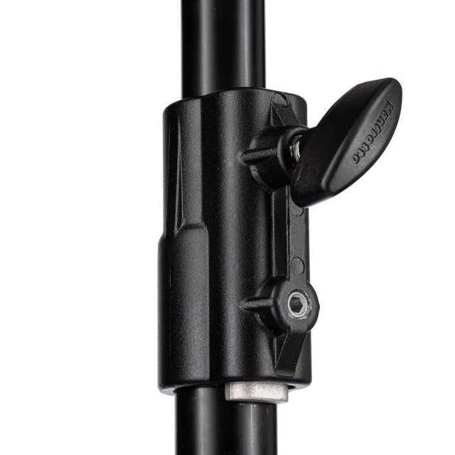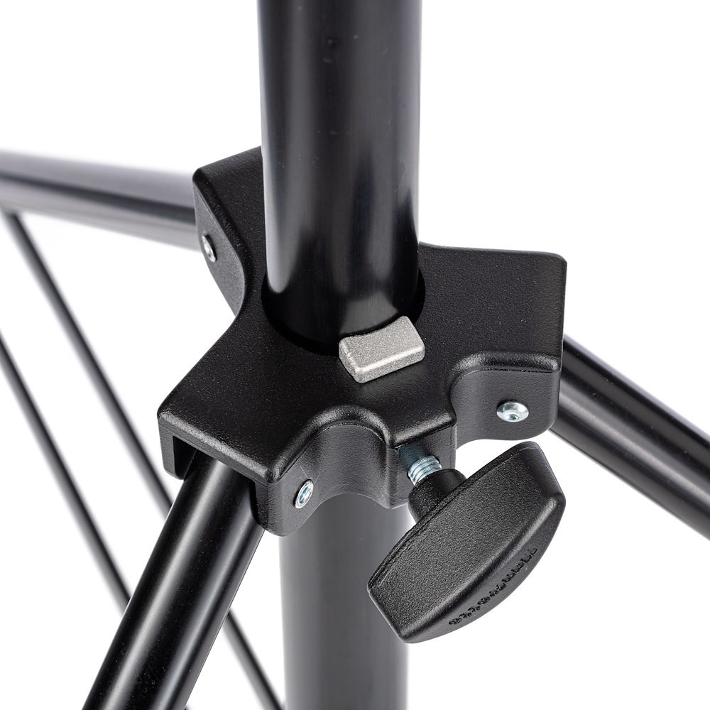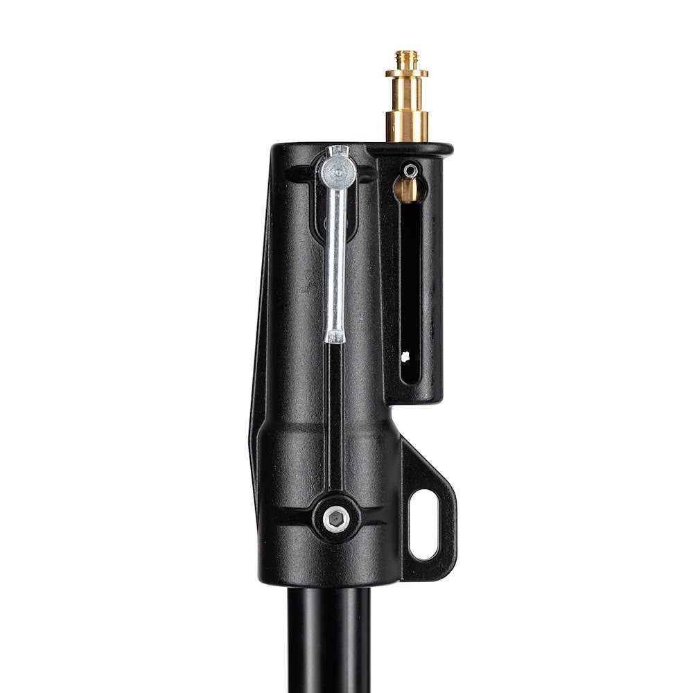 Szintbeállító lábbal rendelkezik, amely egyenetlen felületeken, például lépcsőkön vagy lejtőkön is stabil használatot biztosít. Az állvány maximális terhelhetősége 15 kg, hossza 212 cm-ig nyújtható, zárt állapotban 112 cm, így könnyen tárolható és szállítható. Kettős felső rögzítési lehetőségei – egy 1 1/8" (28 mm) belső fogadó és egy 5/8" (16 mm) külső csap – biztosítják a kompatibilitást a legkülönbözőbb világítófejekkel és kiegészítőkkel.