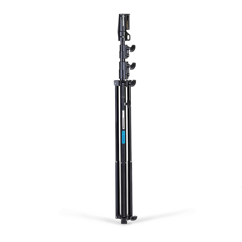 A Manfrotto 007BUAC fekete légrugós alumínium állvány egy nagy teherbírású, hordozható, 3 kg-os alumínium állvány, 3 részes légrugós emelőkkel, 124–315 cm-es kinyújtási tartománnyal és 12 kg-os teherbírással (maximális kinyújtásnál 2,5 kg), dupla merevítésű lábakkal, univerzális 28 mm-es aljzattal + 16 mm-es csapszeggel + 3/8"-os csavarfejjel, egy szintező lábbal és ajánlott kerekekkel, amelyek sziklaszilárd stabilitást biztosítanak helyszíni vagy stúdió világításhoz, módosítókhoz vagy kamerákhoz.