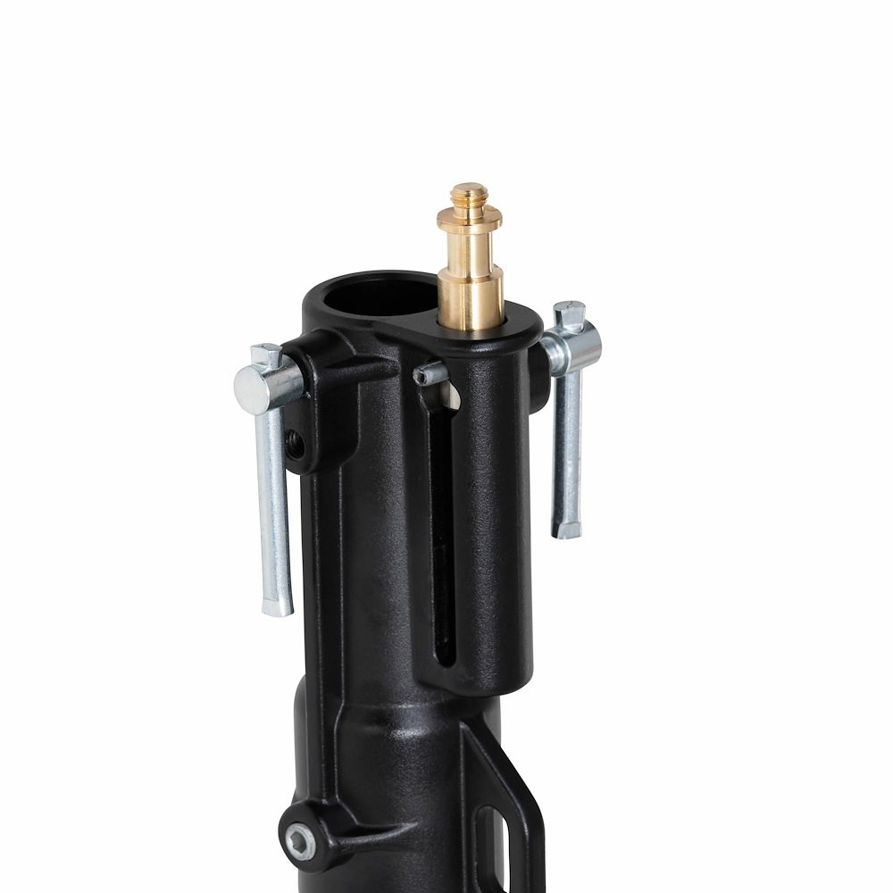 A Manfrotto 298B egy széles, fekete acél pókalapzatot (három rögzíthető kerékkel és egy állítható szintező lábbal) és három ezüst alumínium részt kombinál, amelyek két emelővel simán 300 cm-re nyújthatók. A téglalap alakú acél lábak szállításhoz laposra hajthatók, míg a szintező láb ±15°-ig kompenzálja az egyenetlen padlót. Cserélhető 5/8" (16 mm) baby stud és 3/8"-16 menetes (1/4"-20 reduktor kapható) felső résszel ellátva, tökéletes portréstúdiókhoz, videóforgatásokhoz vagy olyan bérleti készletekhez, amelyekhez kerekes, stabil állványra van szükség, amely 15 kg-ot bír közelről vagy 5 kg-ot teljes magasságban – megbízható tartósság a mindennapi professzionális használathoz.