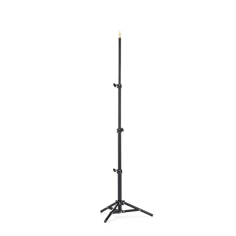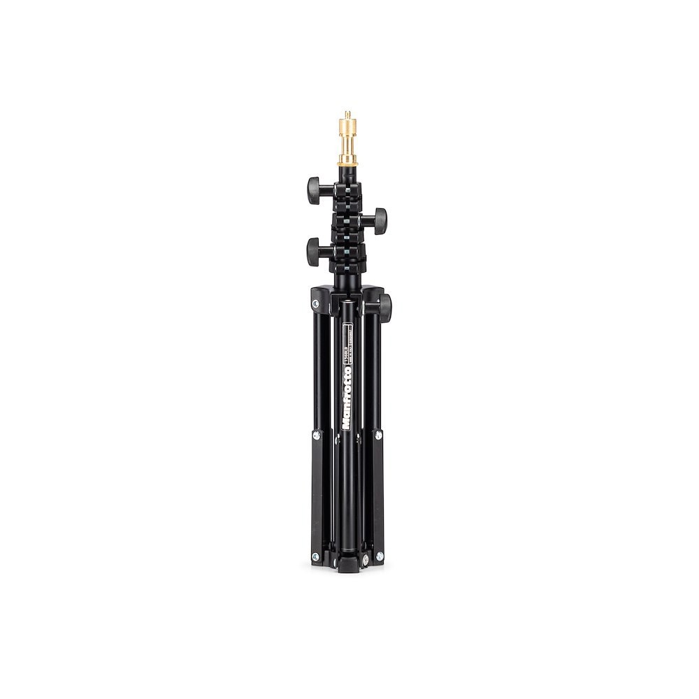 A Manfrotto 156BLB fekete alumínium Mini Pro állvány egy 620 g-os, 4 részes (3 emelővel) ultrakompakt asztali állvány, amely 40 cm-re összecsukható, 123 cm-re kihúzható, és 1,5 kg-ot képes megtartani 5/8" (15,9 mm) baby stud + levehető 1/4"-20 csúccsal – könnyű, merev, alacsony szögű támasztást biztosít kis lámpák, kamerák vagy módosítók számára…