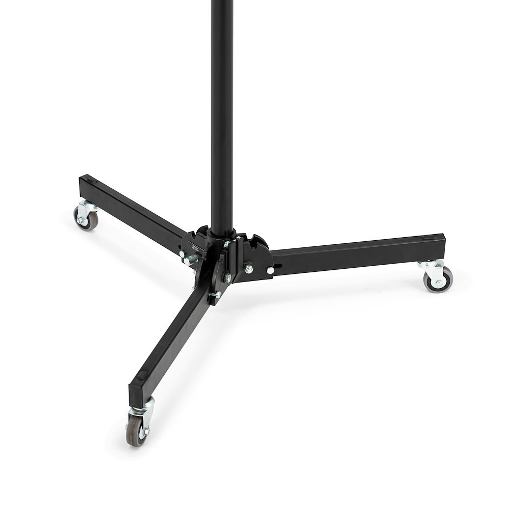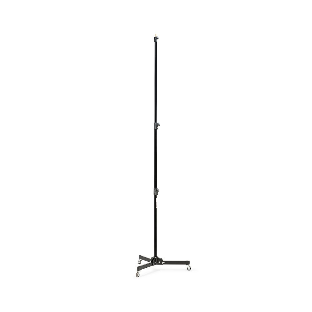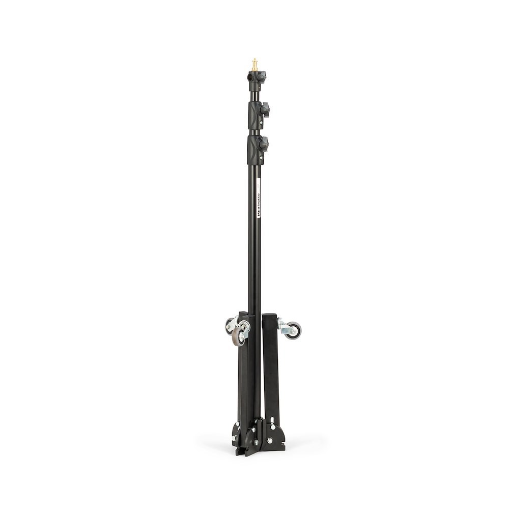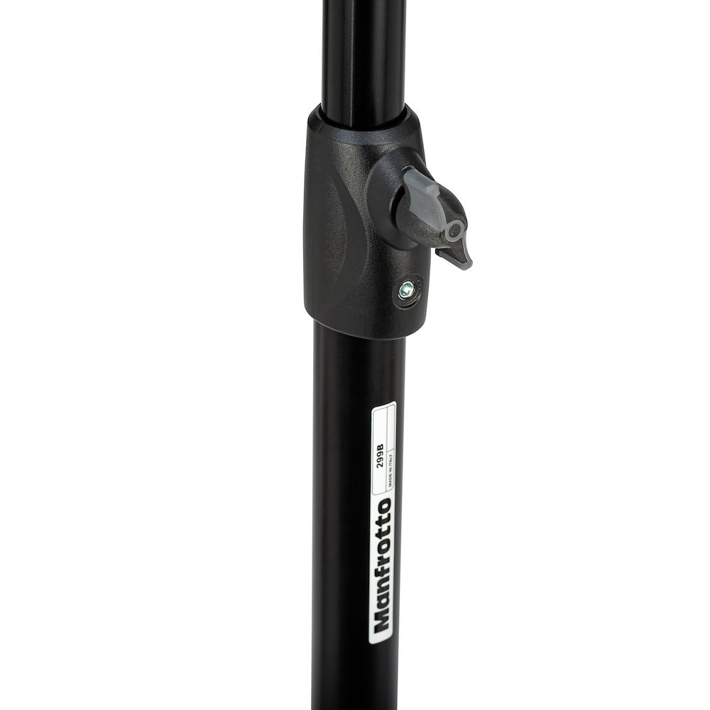 A Manfrotto 299B egy klasszikus, fekete acél alaptartóval rendelkező állvány, ezüst eloxált alumínium emelőkkel, fékezhető kerekekkel és egy szintező lábbal – 272 cm-es magasságig nyújtható, és 12 kg-ot képes biztonságosan megtartani (teljes kinyújtás esetén 2,2 kg). Széles, stabil talpa és beépített kerekei miatt ideális stúdióállvány felső világításhoz, nagy softboxokhoz vagy háttértámaszokhoz.