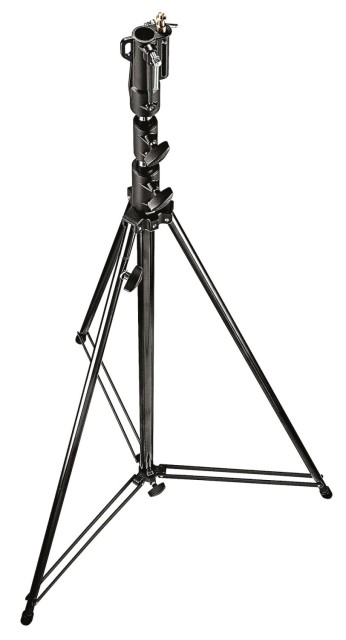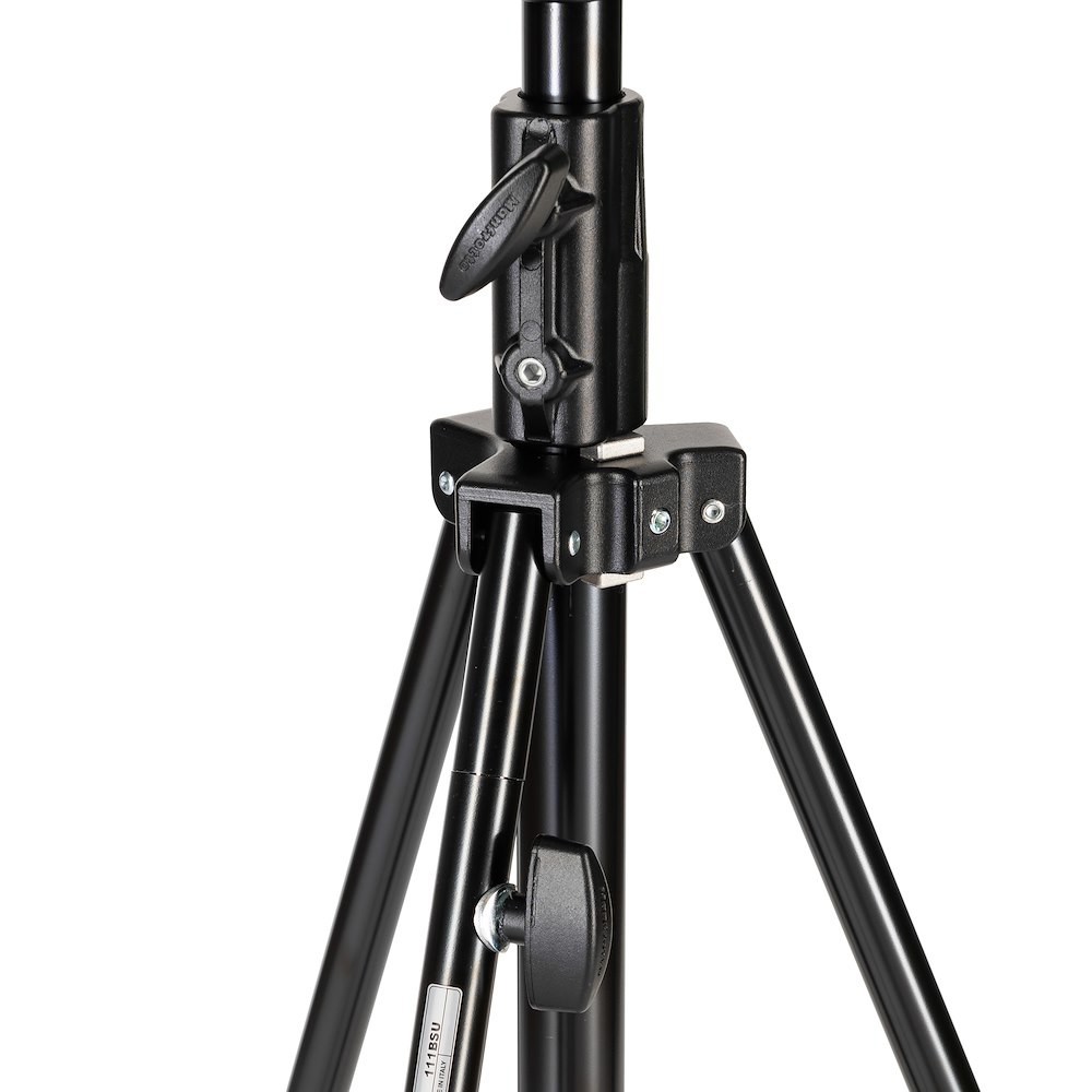 A Manfrotto 111BSU a Manfrotto legendás magas acélállványának fekete változata: három vastag króm-acél szakasz, két emelő, dupla lábtámasz és 127 cm-es széles talpfelület biztosítják a rendkívüli merevséget még 3,8 m teljes magasságban is. A beépített szintező lábak másodpercek alatt kiegyenlítik az egyenetlen talajt, az univerzális 14-es típusú felső rész pedig Junior vevőkészülékeket, Baby csapokat vagy közvetlen 3/8″-os rögzítést fogad el. 109/110/110G kerekek használhatók a stúdióban való mozgathatóság érdekében.