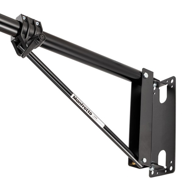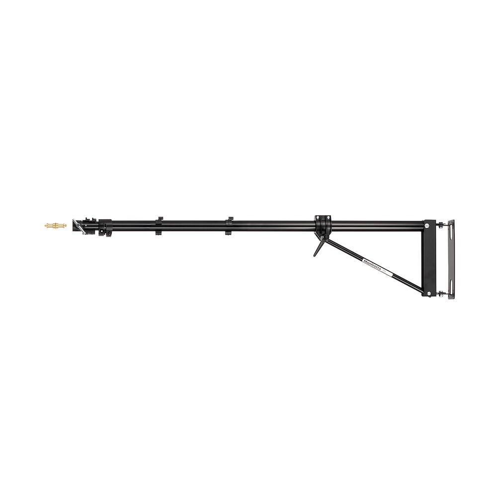 A Manfrotto 098B Black Wall Boom egy kompakt, falra szerelhető, 2 részes alumínium kar (120–210 cm), amely 180°-os vízszintes elforgatást és 160°-os függőleges döntést biztosít, miközben teljes kinyújtás esetén akár 4,5 kg-ot is elbír. Kiválóan alkalmas kis stúdiókhoz, interjú sarkokhoz vagy állandó felső világítási berendezésekhez, ahol a padlófelület korlátozott – négy csavarral (nem tartozék) közvetlenül a falgerendához vagy a falhoz rögzíthető, és tiszta, kábelmentes felső világítást vagy hajvilágítást biztosít.