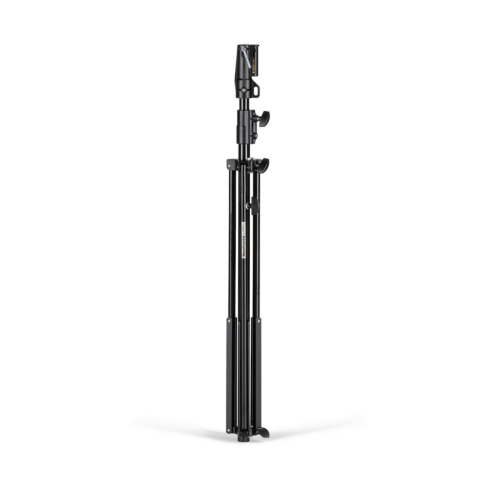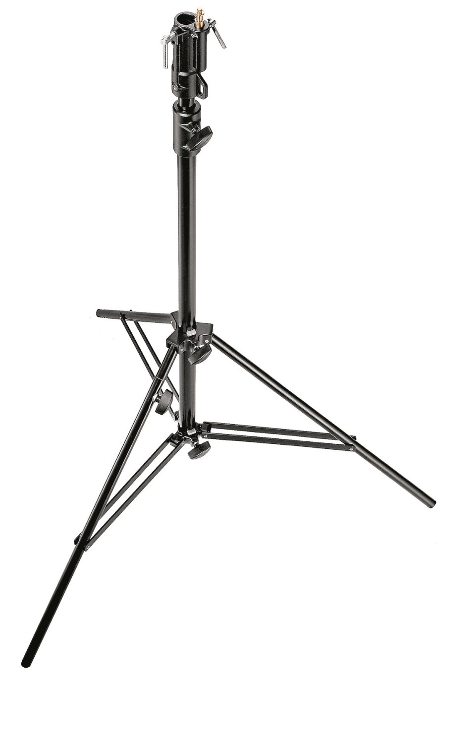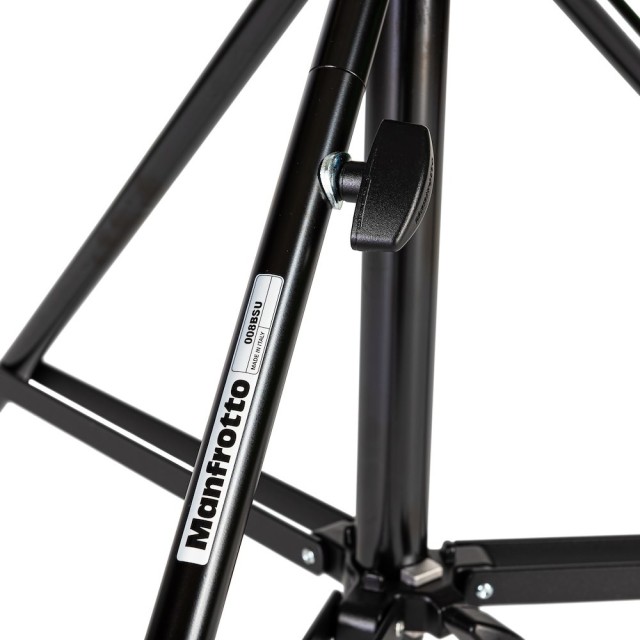 A Manfrotto 008BSU fekete cinkacél junior állvány egy 2 részes, 1 emelővel rendelkező, nagy teherbírású állvány, amely 116–216 cm-re nyújtható, 30 kg teherbírással, kettős merevítésű lábakkal, szintező lábbal, univerzális 28 mm-es aljzattal + 16 mm-es csapfejjel és fekete cink bevonattal rendelkezik, sziklaszilárd stabilitást biztosítva közepes méretű lámpák, módosítók vagy mikrofonállványok számára stúdióban vagy helyszínen.