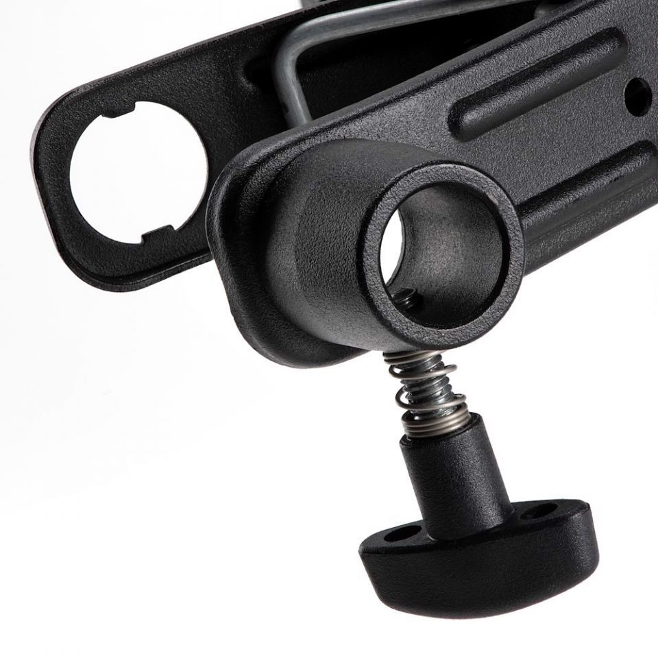 A mindössze 350 g súlyú bilincs rendkívül erős rugós mechanizmussal rendelkezik, amely biztosítja a különböző felületeken vagy tárgyakon való szoros rögzítést, és akár 2 kg teherbírással is büszkélkedhet. A bilincs pofái maximum 40 mm átmérőjűre nyúlnak ki, így könnyen rögzíthető egy oszlophoz, egy polchoz, egy szék háttámlájához vagy akár egy fa ágához, hogy csak néhányat említsünk a sok lehetőség közül. A rugós szorítópofák belső oldalán számos tartós kemény gumiból készült szegecs található, amelyek további tapadást biztosítanak, különösen hasznosak szabálytalan alakú felületeken.