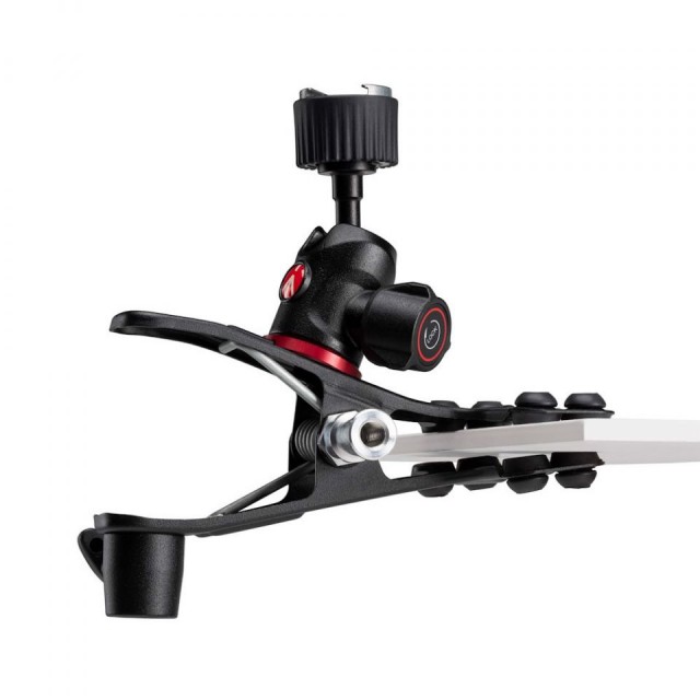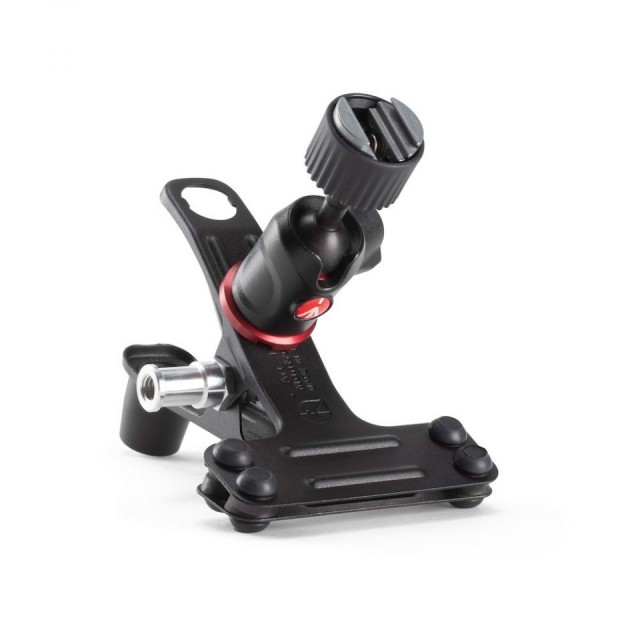 A bilincshez egy megbízható, többállású, Manfrotto középső gömbfej van rögzítve, teljes pan és billenő mozgással. Miután a bilincset a kiválasztott felülethez rögzítették, a gömbfej egyetlen reteszelőgombja lehetővé teszi a felhasználó számára, hogy a tartozékot pontosan a megfelelő szögben pozícionálja, és egy egyszerű csavarással szilárdan rögzítse a pozícióban. A gömbfej tetején található a Manfrotto nagyra értékelt vaku tartó mechanizmusa. Ez az egyedülálló rögzítő lehetővé teszi a felhasználó számára, hogy egyszerűen és biztonságosan rögzítse a kiválasztott tartozékot a gömbfejhez. Egyszerűen csavarja le a gyűrűt a vakupapucs kinyitásához, csúsztassa be a tartozékot, majd húzza meg a gyűrűt, hogy szilárdan rögzítse a gömbfejhez.