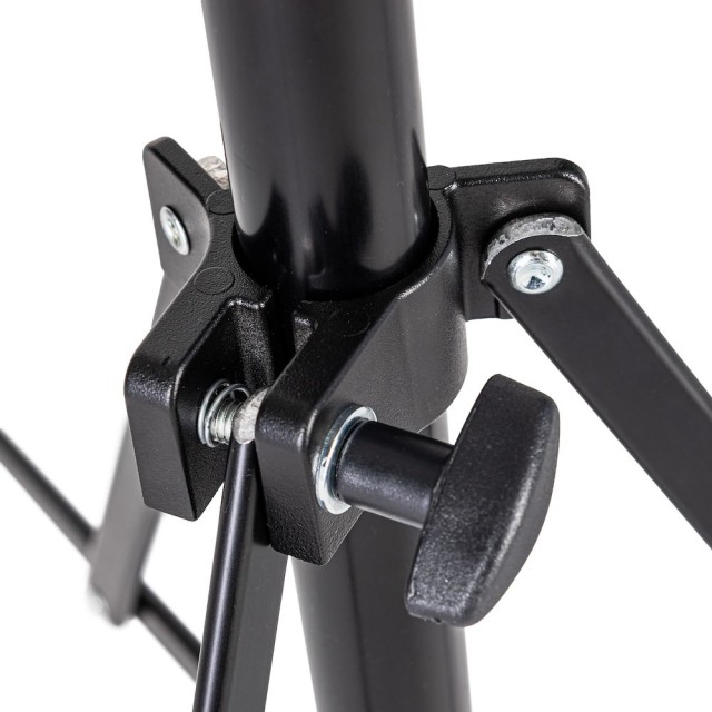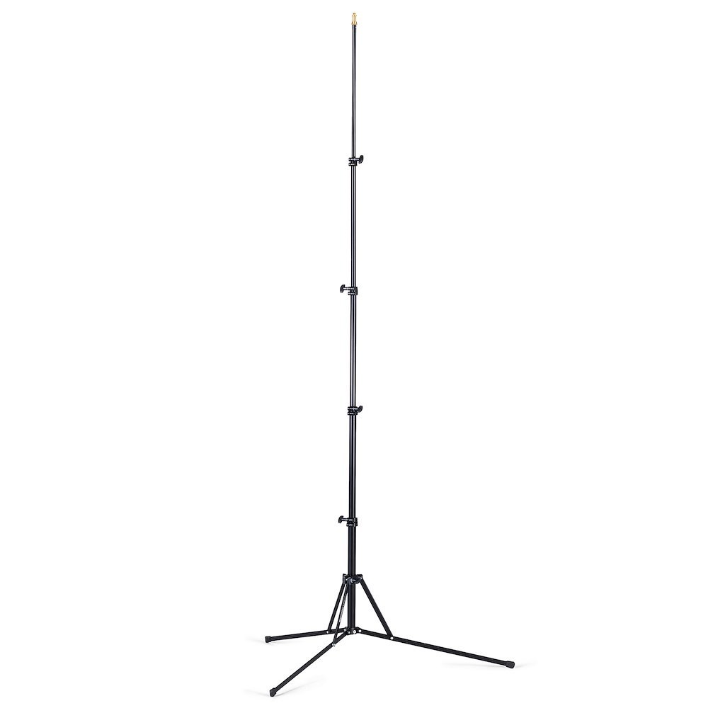 A Manfrotto 5001B-1 Nano állvány professzionális szintű stabilitást biztosít fekete eloxált alumínium vázában, amely mindössze 49 cm-re összecsukható. Öt szakasz (25/22/19/16/13 mm) négy csavaros rögzítésű emelővel simán 190 cm-es maximális magasságig nyitható, míg a fordítottan összecsukható téglalap alakú lábak (15×5 mm) 100 cm-es alapterületet biztosítanak, így 1,5 kg-os terhelés mellett sem ingadozik. A tetején egy 16 mm-es (5/8") baby stud található, cserélhető 19-es típusú adapterrel (3/8"-16 vagy 1/4"-20 menettel) az univerzális kompatibilitás érdekében. 960 g-os súlyával ez a végső könnyűsúlyú megoldás vloggerek, tartalomkészítők vagy operatőrök számára, akiknek gyors felállításra, repülőgépen való szállításra alkalmas méretre és sziklaszilárd teljesítményre van szükségük kompakt COB LED-ekkel, speedlightokkal vagy mini softboxokkal.