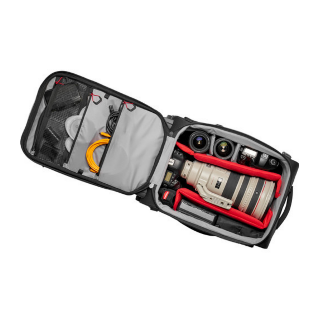 A Manfrotto fekete Pro Light Reloader Switch-55 hátizsákban/rollerben kényelmesen tárolhat, szállíthat és védhet egy vagy két profi DSLR fényképezőgépet, egy 400 mm-es f/2.8-as objektívet, akár három extra objektívet és egy 17"-os laptopot. Ez a sokoldalú táska párnázott, érintéssel rögzíthető belső elválasztókkal és külső cipzáras zsebekkel rendelkezik. A fotósok értékelni fogják a cipzáras fedél két oldalsó zsanérját, amelyek lehetővé teszik, hogy a fedél függőleges helyzetben maradjon, és így hozzáférhessen a fedélzsebekben tárolt felszereléshez.