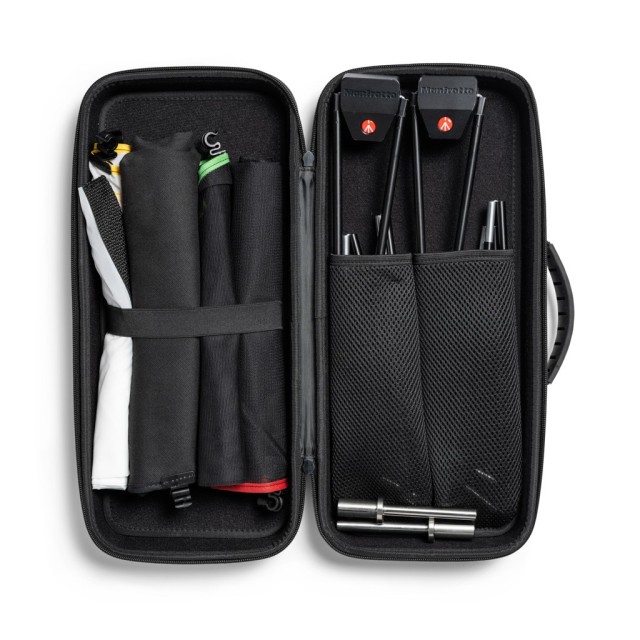 A belső rekeszekkel ellátott, strapabíró tok biztosítja, hogy minden a helyén maradjon a következő fotózásig, elősegítve a gyors összeszerelést és javítva a munkafolyamatot.