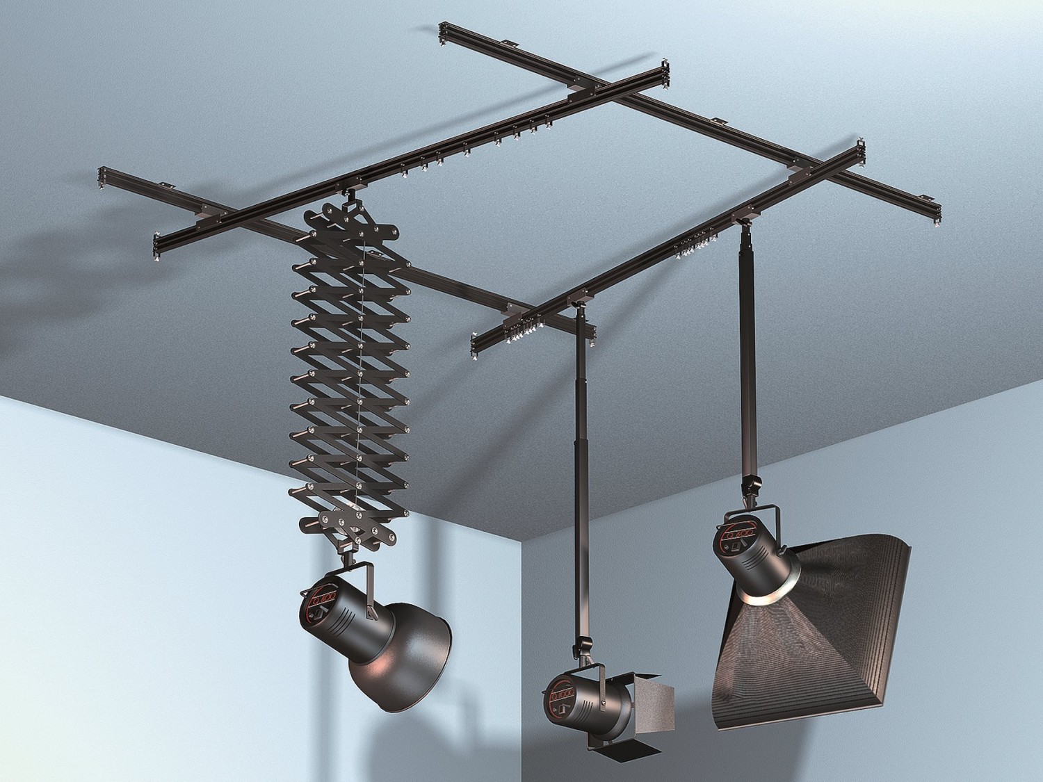 Az FF3033 „System 33” a Manfrotto klasszikus, kulcsrakész felső sínekből álló megoldása egy tipikus, 3–4 m széles fényképezőteremhez. Két rögzített sín párhuzamosan van felszerelve a falhoz, míg két mozgatható sín merőlegesen fut a kocsikon, így egy teljes X-Y rácsot alkotva, amelyen három lámpa csendesen csúszhat a díszlet felett bármely pozícióba. A mellékelt rugós pantográf tökéletesen kiegyensúlyozza a 2–10 kg közötti terheléseket (opcionális erősebb rugókkal 18 kg-ig bővíthető), és használaton kívül szinte a mennyezetig felhajtható. A teleszkópos oszlopok rugalmas magasságot biztosítanak, és az egész rendszer fekete eloxált, hogy ne okozzon tükröződést. Később könnyen bővíthető további pantográfokkal, sínekkel vagy motoros vezérléssel.