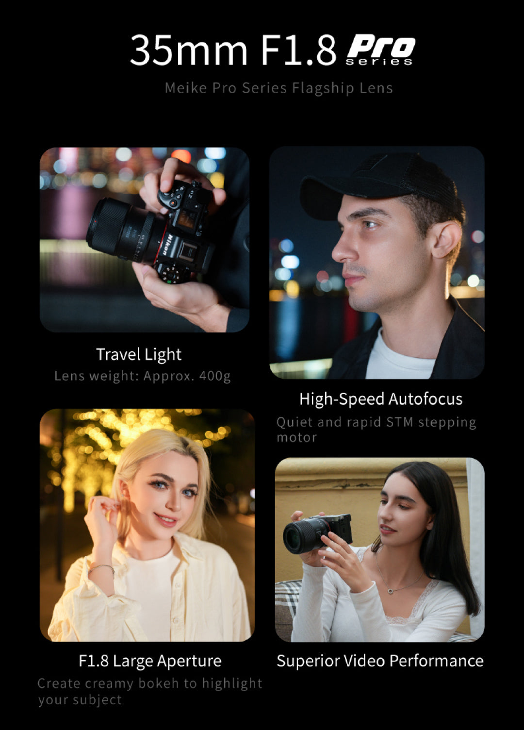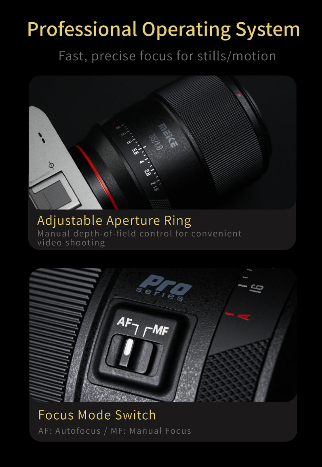 Meike 35mm f1.8 Pro Full Frame Auto Focus STM objektív Sony E Mount fényképezőgépekhez. Készítsen lenyűgöző képeket a Meike 35mm f/1.8 STM Auto Focus objektívvel, amelyet kifejezetten Sony full frame fényképezőgépekhez terveztek. Ez a sokoldalú primer objektív fényerős f/1,8-as rekeszértékkel rendelkezik, amely tökéletes a gyönyörű bokeh eléréséhez és a gyenge fényviszonyok között való kiválósághoz.