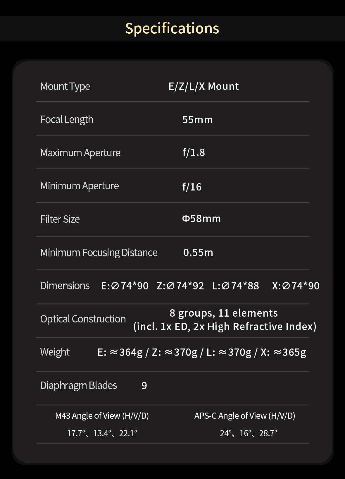| Gyújtótávolság | 55mm |