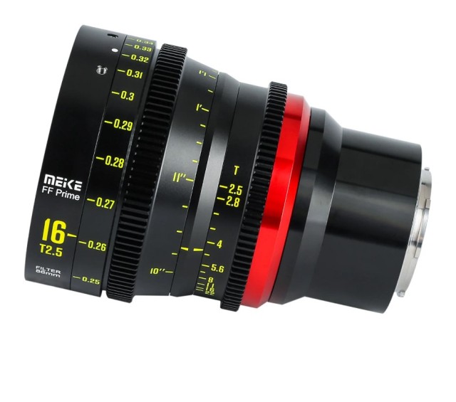 Ez a Meike hatodik FF cine objektívje, és most csatlakozik az FF cine objektívek családjához. 45 mm-es képkört fed le. PL, Canon EF, Canon RF, Sony E és Panasonic L foglalatokkal egyaránt kapható. A teljes készlet tartalmazza a 16mmT2.5,24mm,35mm,50mm,85mm,105mmT2.1,135mmT2.4 objektíveket. A fókusz- és rekeszgyűrűn az iparági szabványnak megfelelő 0,8 mm-es osztású fogaskerekekkel rendelkezik.A Meike 16mm T2.5 FF-Prime objektív kialakítása tizenhat elemből áll tizenegy csoportban.A rekeszmechanizmus 11 rekeszlapátból áll. A minimális fókusztávolság 30 cm.