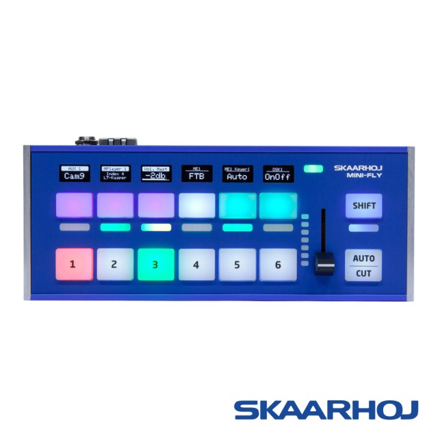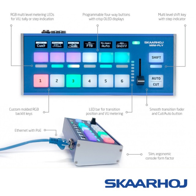 Akompakt és rugalmas Skaarhoj Mini Fly vezérlőpanelt az overheadek (beleértve a Blackmagic Design ATEM, vMix és sok más)kényelmes vezérlésére tervezték kisebb, legfeljebb 6 kamerából álló produkciókhoz. Kis mérete ellenére az OLED kijelző RGB háttérvilágítású címkéket és gombokat, hangszint/interlace állapot előnézetet, szablyát az interlace effektek vezérléséhez, 1/4"-20-as menetet az alján az opcionális fix rögzítéshez, Ethernet-csatlakozót (beleértve) kínál. PoE (IEEE802.3af) stb.