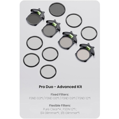 A MOFAGE Pro Duo Advanced Kit a POCO adapterhez készült cserélhető szűrők végső gyűjteménye, amely teljes fényvezérlést és kreatív diffúziót kombinál. Tartalmaz négy FSND rögzített szűrőt (0,3,0,6,0,9, 1,2) 1-4 fokozatú fénycsökkentéshez, valamint a népszerű 1/8 és 1/4 Glimmer Diffusion szűrőket a gyönyörű filmes ragyogáshoz. A rendszer teljes mértékben egymásra rakható, így az ND teljesítmény kreatív effektusokkal kombinálható.