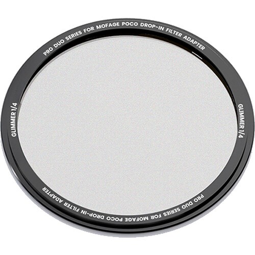 A Mofage Glimmer 1/4 rugalmas szűrő egy speciális diffúziós szűrő a POCO Pro Duo rendszerhez. Lágyabb képet hoz létre és csökkenti a kontrasztot, így kívánatos , tiszta, virágzó fényeket biztosít, amelyek finom, éteri megjelenést kölcsönöznek. Rugalmas szűrőként úgy tervezték, hogy a Pro Duo rögzített szűrőkkel (FSND vagy Clear) kombinálva használható legyen a kombinált hatások elérése érdekében.