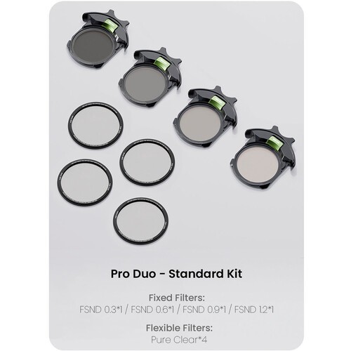 A MOFAGE Pro Duo Standard Kit a POCO Adapter drop-in rendszer alapvető kiegészítője, amely professzionális Full Spectrum Neutral Density (FSND) vezérlést biztosít. Négy rögzített ND szűrőt (0,3,0,6,0,9, 1,2) tartalmaz 1-4 fokozatú fénycsökkentéshez, valamint négy Pure Clear Flexible szűrőt a fókusz hatástalan fenntartásához. A teljes készlet egymásra rakható, így kombinált ND-erősségként akár ND2,4-ig (8 fokozat) is használható.