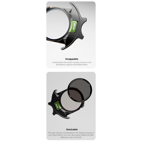 Sokoldalúan kombinálható: A kétrészes Pro Duo rendszer lehetővé teszi, hogy a mellékelt fix ND szűrők bármelyike párosítható legyen a négy Pure Clear Flexible szűrő egyikével. Ezenkívül a szűrők stratégiailag egymásra helyezhetők a nagyobb fénycsökkentés elérése érdekében, így akár ND2,4 (8 fokozat) érték is elérhető további 1,2 szűrőkkel (külön megvásárolhatók vagy az Advanced Kit készletben megtalálhatók).