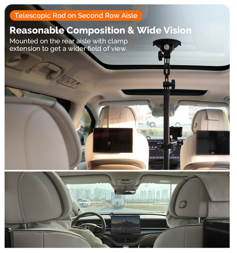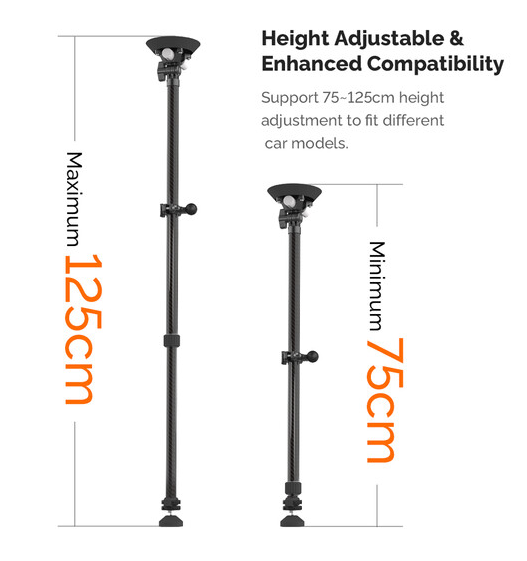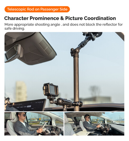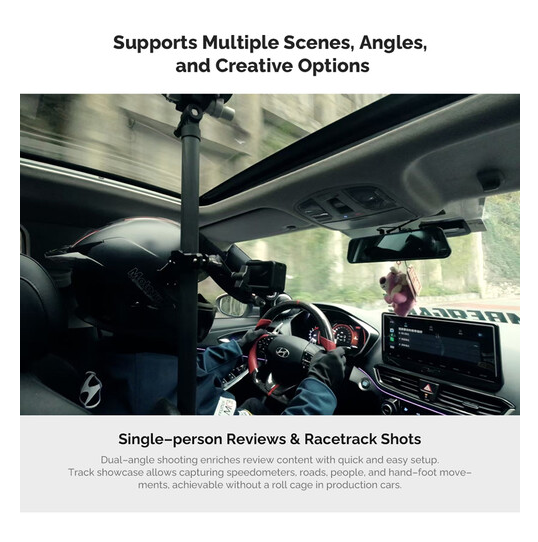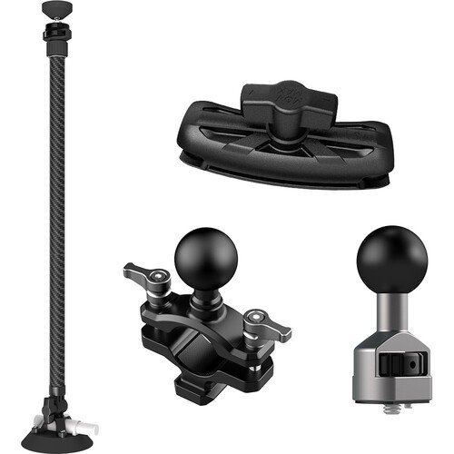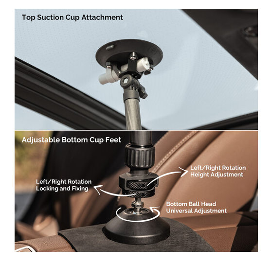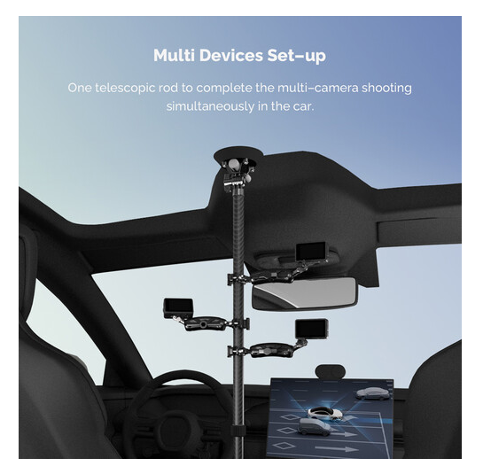 A MOVMAX állítható teleszkópos rúd 1/4"-20 csavarral stabil felvételeket tesz lehetővé az autó szélvédőjén keresztül, 75–125 cm-es hosszúságig nyújtható, szénszálas szerkezettel, dupla tapadókorongokkal a napfénytetőre és a középkonzolra való rögzítéshez, valamint 1/4"-20 gömbfejjel, dupla aljzatos karral és gömbfejjel ellátott rúdbilinccsel a kamera teljes mozgathatóságához.