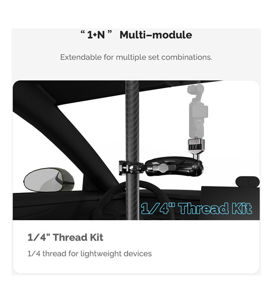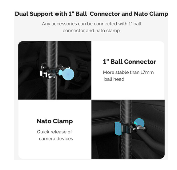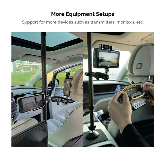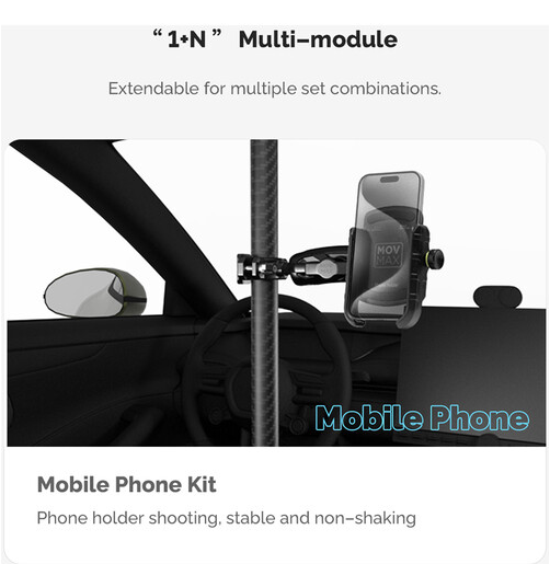A MOVMAX állítható teleszkópos rúd okostelefon-bilinccsel lehetővé teszi a mobil eszközökkel történő stabil felvételkészítést az autó szélvédőjén keresztül. Hossza 75–125 cm között állítható, könnyű szénszálas szerkezettel, dupla tapadókorongokkal a napfénytetőhöz és a középkonzolhoz, valamint mellékelt okostelefon-bilinccsel gömbfejjel, 3,9 hüvelykes dupla aljzatos karral és rúdbilinccsel gömbfejjel a teljesen állítható pozícióhoz.
