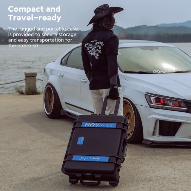 A MOVMAX Grip Dolly Pro Kit egy nagy teherbírású dolly rendszer, amelynek teherbírása 198 font. Tartalmaz egy lapos lemezt, 75/100/150 mm-es gömbadaptereket, egy Mitchell lemezadaptert és polimer futókerékeket a stabil mozgás érdekében. A dolly több 1/4"-20 és 3/8"-16 menettel, középső és oldalsó támasztékokkal rendelkezik, és könnyű szállítás és tárolás érdekében repülőgépes szállítótáskával együtt kerül forgalomba.